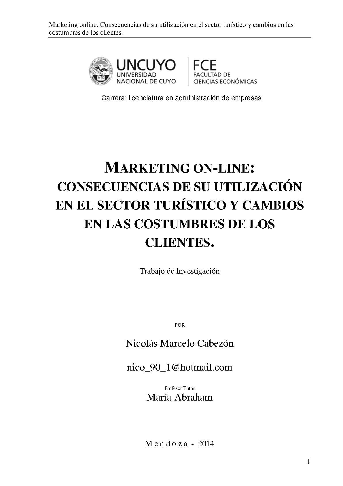 Cabezón, Nicolás Marcelo. (2014). Marketing online: consecuencias de su utilización en el sector turístico y cambios en las costumbres de los clientes (Trabajo final de grado). Mendoza, Universidad Nacional de Cuyo. Facultad de Ciencias Económicas.