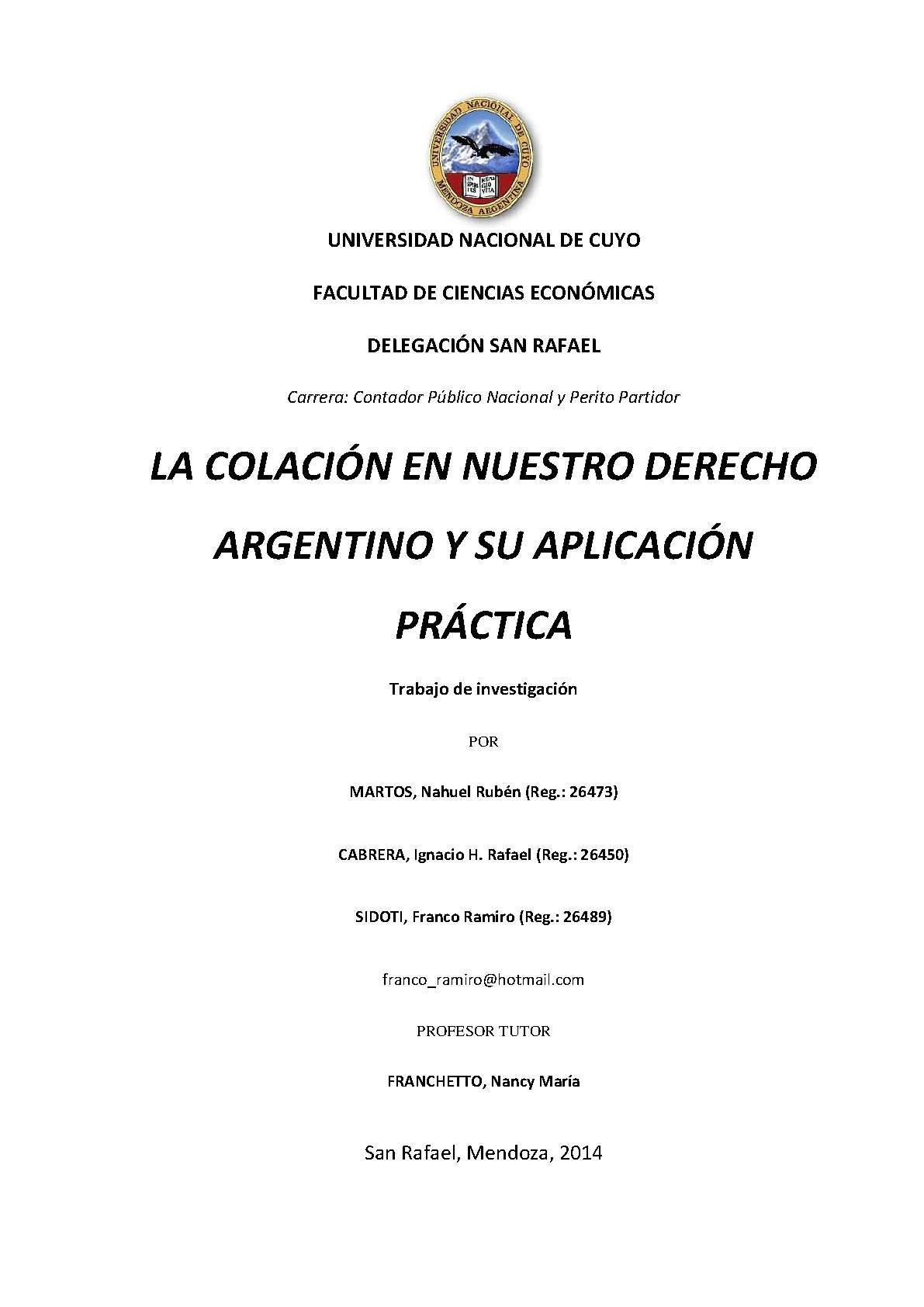 Se desarrollará un profundo análisis en el Derecho Argentino respecto de la figura de la colación y la tarea del profesional en Ciencias Económicas y de los distintos conflictos que se pueden presentar, al igual que las soluciones, tomando en consideración, a modo de apoyo, el proyecto de reforma del Código Civil.
