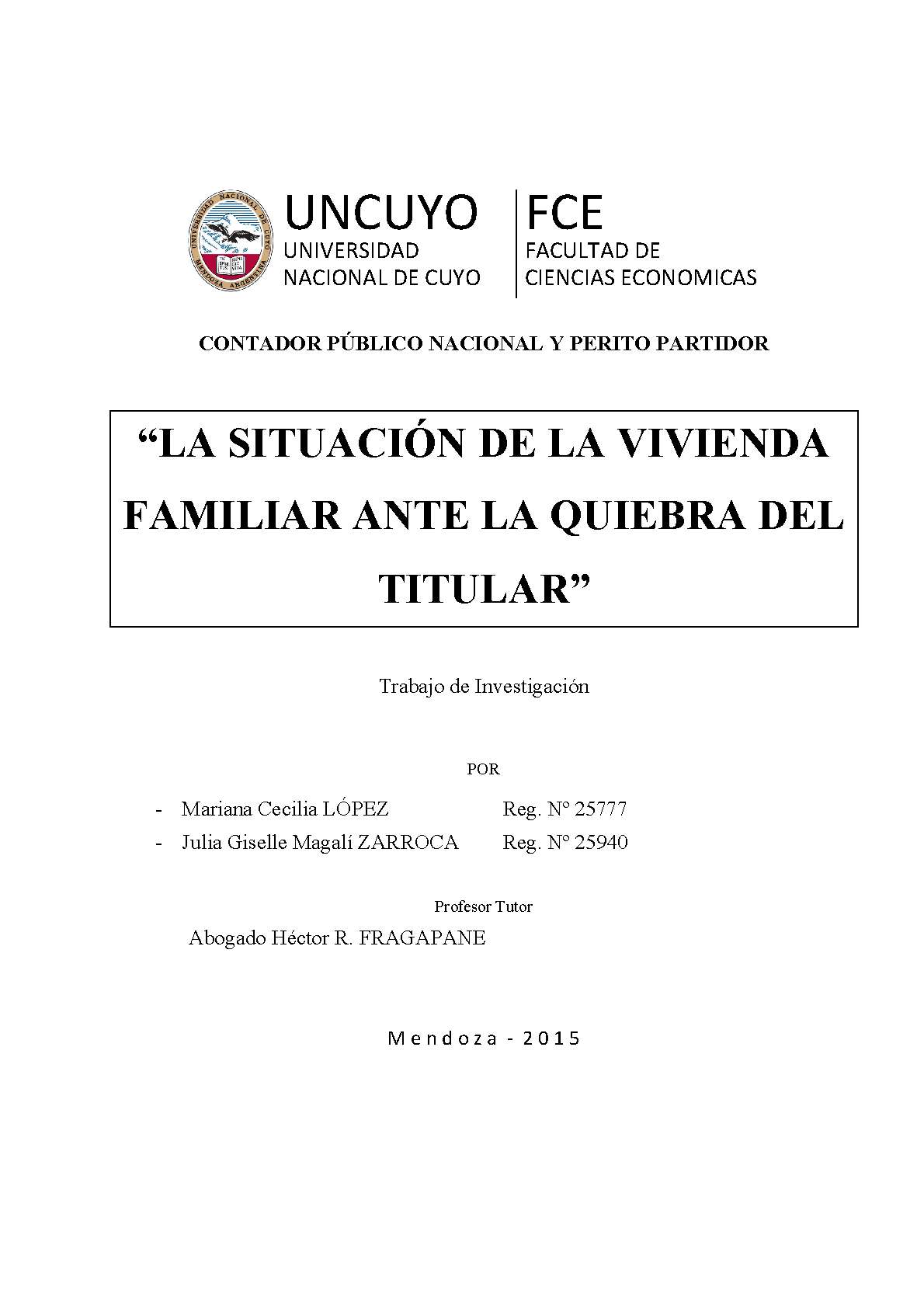 Zarroca, Julia Giselle Magalí; López, Mariana Cecilia. (2015). La situación de la vivienda familiar ante la quiebra del titular: (Trabajo final de grado). Mendoza, Universidad Nacional de Cuyo. Facultad de Ciencias Económicas.
