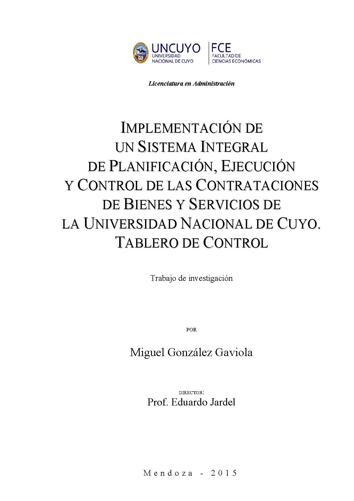 González Gaviola, Miguel. (2015). Implementación de un sistema integral de planificación, ejecución y control de las contrataciones de bienes y servicios de la Universidad Nacional de Cuyo: tablero de control (Trabajo final de grado). Mendoza, Universidad Nacional de Cuyo. Facultad de Ciencias Económicas.