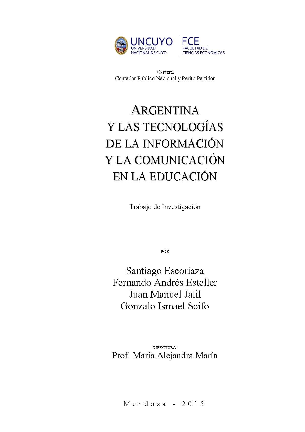 Escoriaza, Santiago; Esteller, Fernando Andrés; Jalil, Juan Manuel; Scifo, Gonzalo Ismael. (2015). Argentina y las tecnologías de la información y la comunicación en la educación: (Trabajo final de grado). Mendoza, Universidad Nacional de Cuyo. Facultad de Ciencias Económicas.