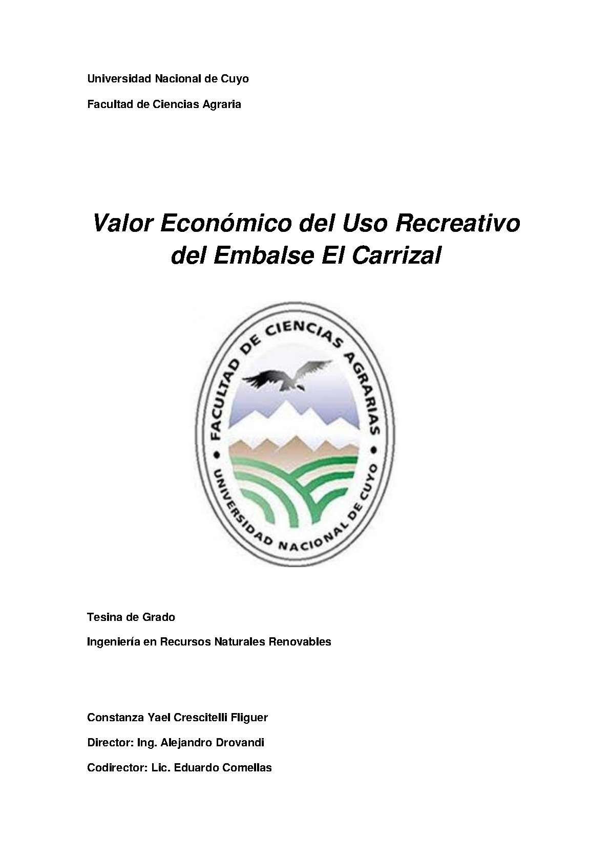 En este trabajo se utilizó el Método de Costo de Viaje para estimar el valor económico para uso recreativo del Embalse El Carrizal para la temporada estival 2014/2015; posteriormente se realizó un análisis comparativo con el valor económico obtenido en la temporada estival 2002/2003 por Comellas (2003). Asimismo, se lo relacionó con el grado de contaminación del agua del embalse, medido para algunos parámetros seleccionados, para la temporada estival 2014/2015, estableciendo un análisis comparativo con los datos correspondientes a la temporada estival 2002/2003 obtenido por Drovandi y otros (2003). Por último, se plantearon distintos escenarios territoriales con el objetivo de dar recomendaciones para un manejo más sustentable del recurso hídrico del embalse y de sus alrededores.