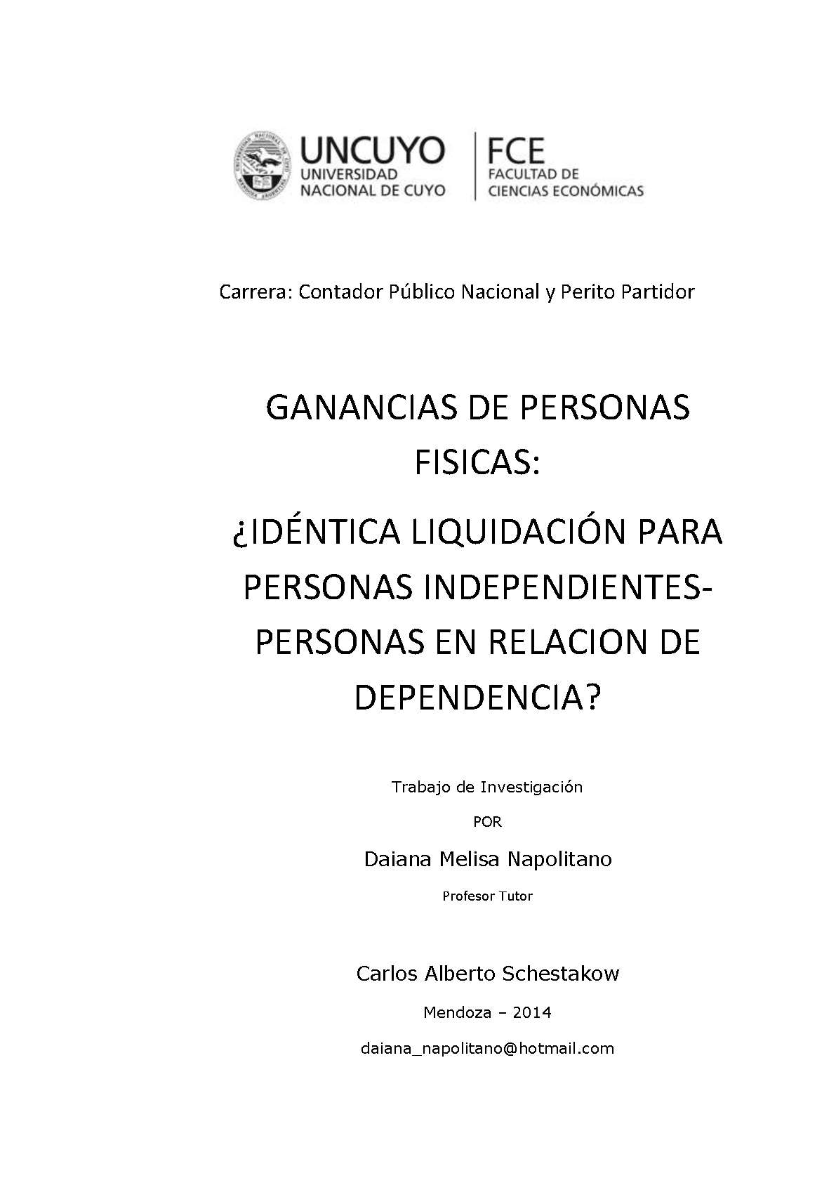 Napolitano, Daiana. (2014). Ganancia de personas físicas: ¿Idéntica liquidación para personas independientes-personas en relación de dependencia? (Trabajo final de grado). Mendoza, Universidad Nacional de Cuyo. Facultad de Ciencias Económicas.