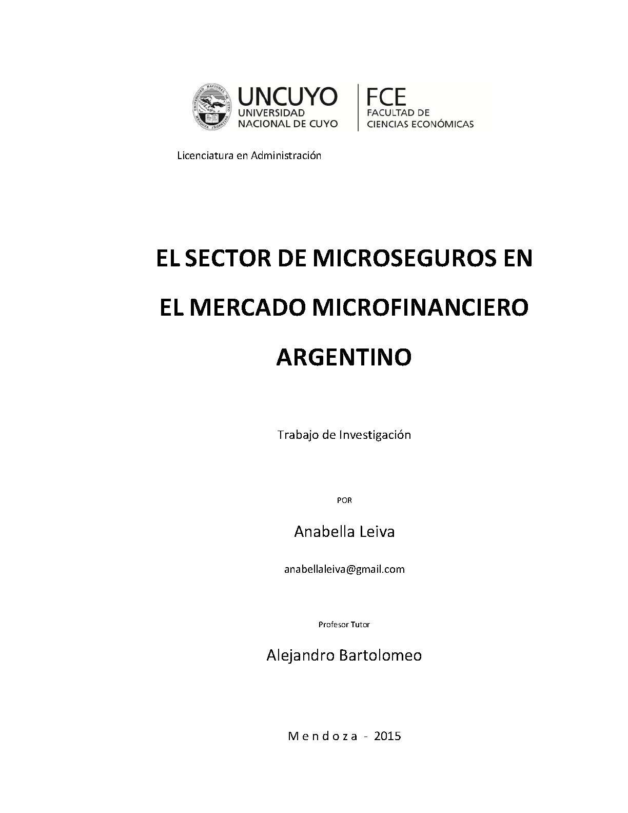 Leiva, Anabella Sabrina. (2015). El sector de microseguros en el mercado microfinanciero argentino: (Trabajo final de grado). Mendoza, Universidad Nacional de Cuyo. Facultad de Ciencias Económicas.
