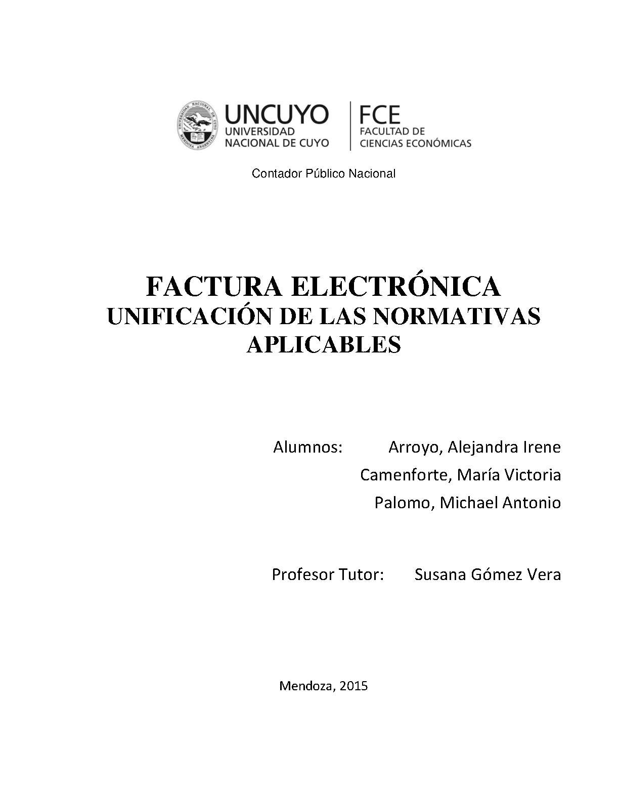 Arroyo, Alejandra Irene; Camenforte, María Victoria; Palomo, Michael Antonio. (2015). Factura electrónica: unificación de las normativas aplicables (Trabajo final de grado). Mendoza, Universidad Nacional de Cuyo. Facultad de Ciencias Económicas.