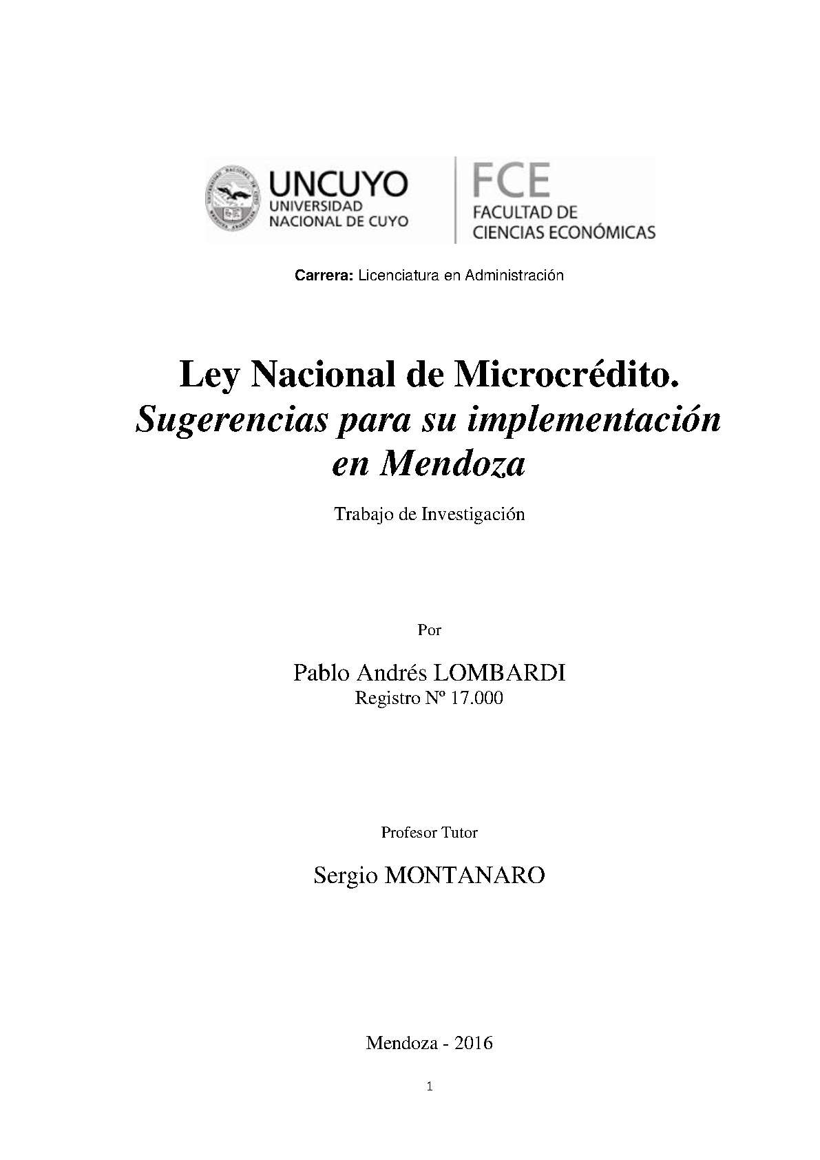 Lombardi, Pablo Andrés. (2015). Ley Nacional de Microcrédito: sugerencias para su implementación en Mendoza (Trabajo final de grado). Mendoza, Universidad Nacional de Cuyo. Facultad de Ciencias Económicas.