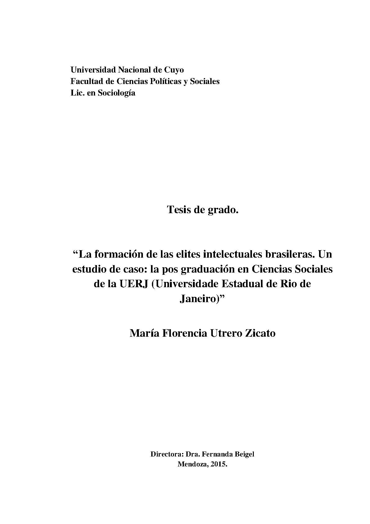Utrero Zicato, María Florencia. (2015). La formación de elites intelectuales brasileras: un estudio de caso: la pos graduación en Ciencias Sociales de la UERJ (Universidade Estadual de Rio de Janeiro) (Tesina de grado). Mendoza, Universidad Nacional de Cuyo. Facultad de Ciencias Políticas y Sociales .