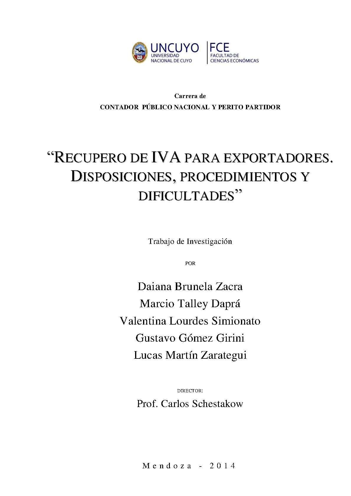 Zacra, Daiana Brunela; Talley Daprá, Marcio; Simionato, Valentina Lourdes; Gómez Girini, Gustavo; Zarategui, Lucas Martín. (2014). Recupero de IVA para exportadores: disposiciones, procedimientos y dificultades (Trabajo final de grado). Mendoza, Universidad Nacional de Cuyo. Facultad de Ciencias Económicas.