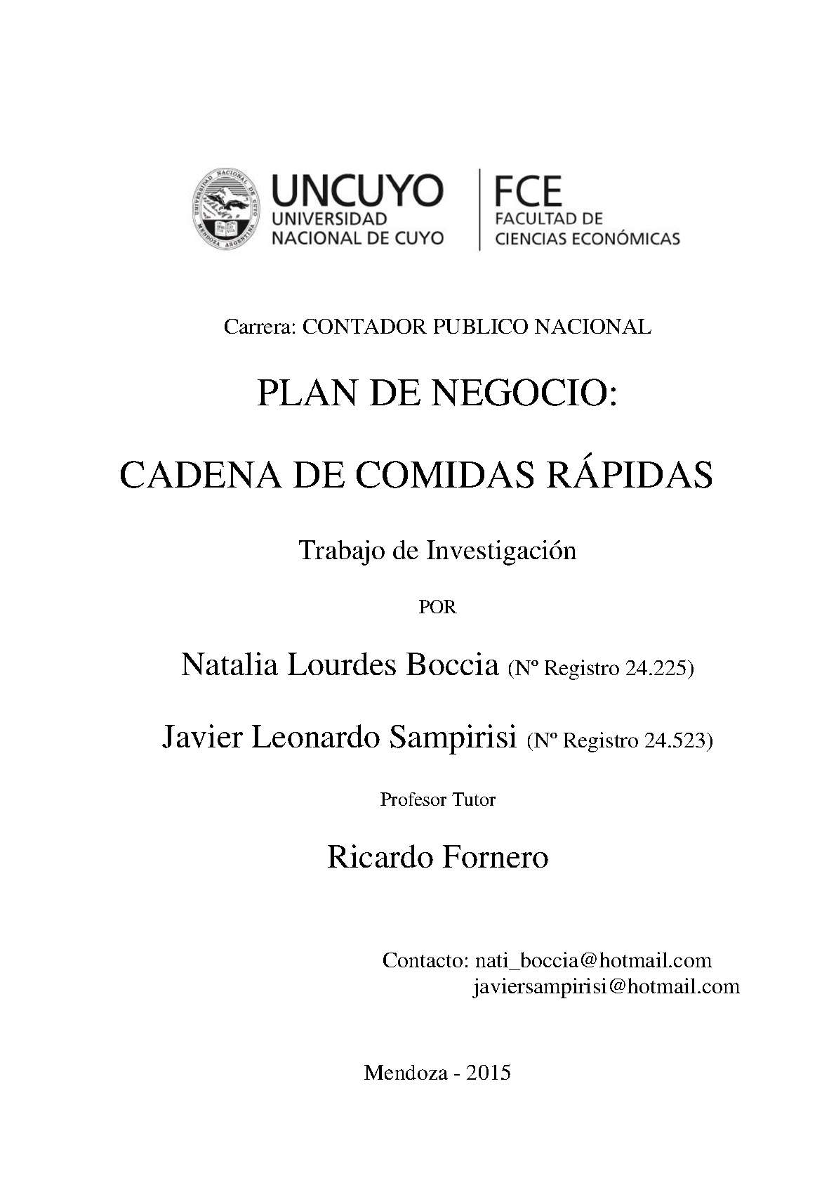 Boccia, Natalia Lourdes; Sampirisi, Javier Leonardo. (2015). Plan de negocio: cadena de comidas rápidas (Trabajo final de grado). Mendoza, Universidad Nacional de Cuyo. Facultad de Ciencias Económicas.