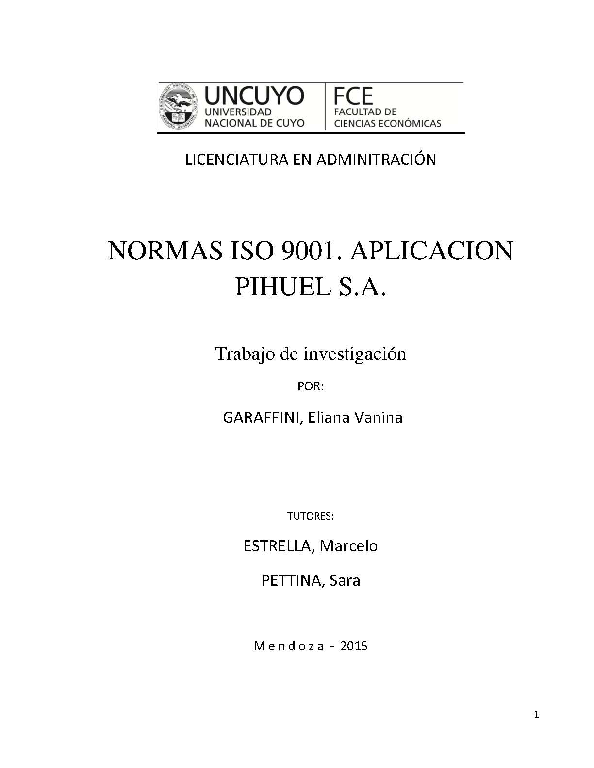 Garaffini, Eliana Vanina. (2015). Normas ISO 9001: aplicación Pihuel S.A. (Trabajo final de grado). Mendoza, Universidad Nacional de Cuyo. Facultad de Ciencias Económicas.