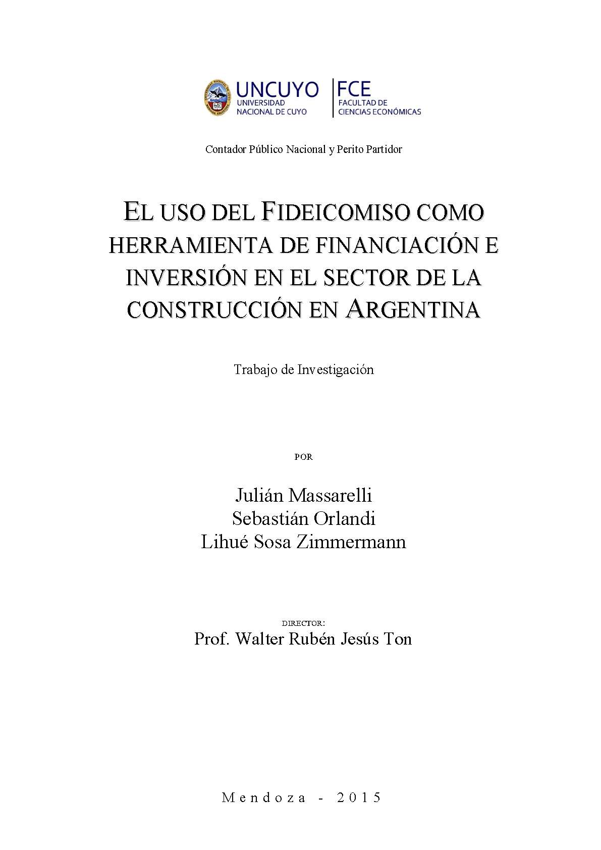 Massarelli, Julián Andrés; Orlandi, Fernando Sebastián; Sosa Zimmermann, Lihué. (2015). El uso del fideicomiso como herramienta de financiación e inversión en el sector de la construcción en Argentina: (Trabajo final de grado). Mendoza, Universidad Nacional de Cuyo. Facultad de Ciencias Económicas.