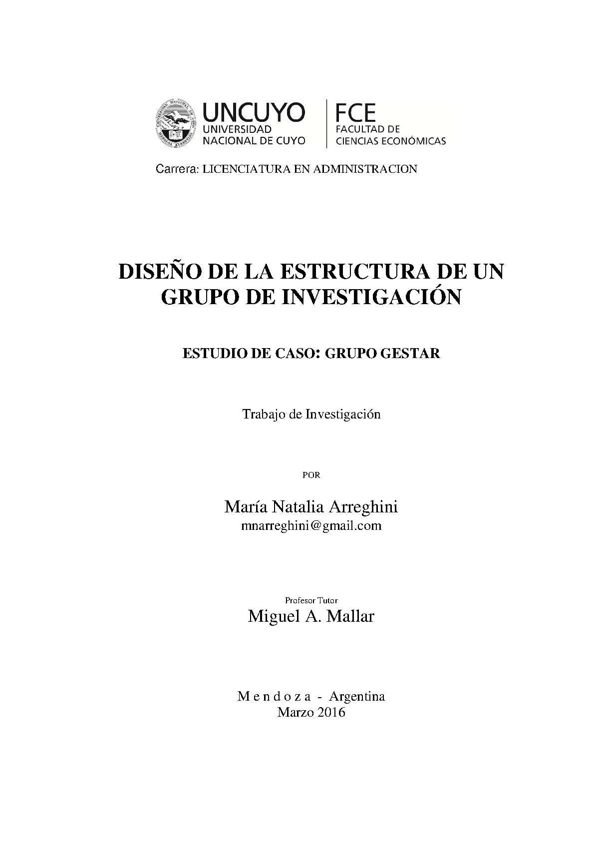 Arreghini, María Natalia. (2016). Diseño de la estructura de un grupo de investigación : (Trabajo final de grado). Mendoza, Universidad Nacional de Cuyo. Facultad de Ciencias Económicas.