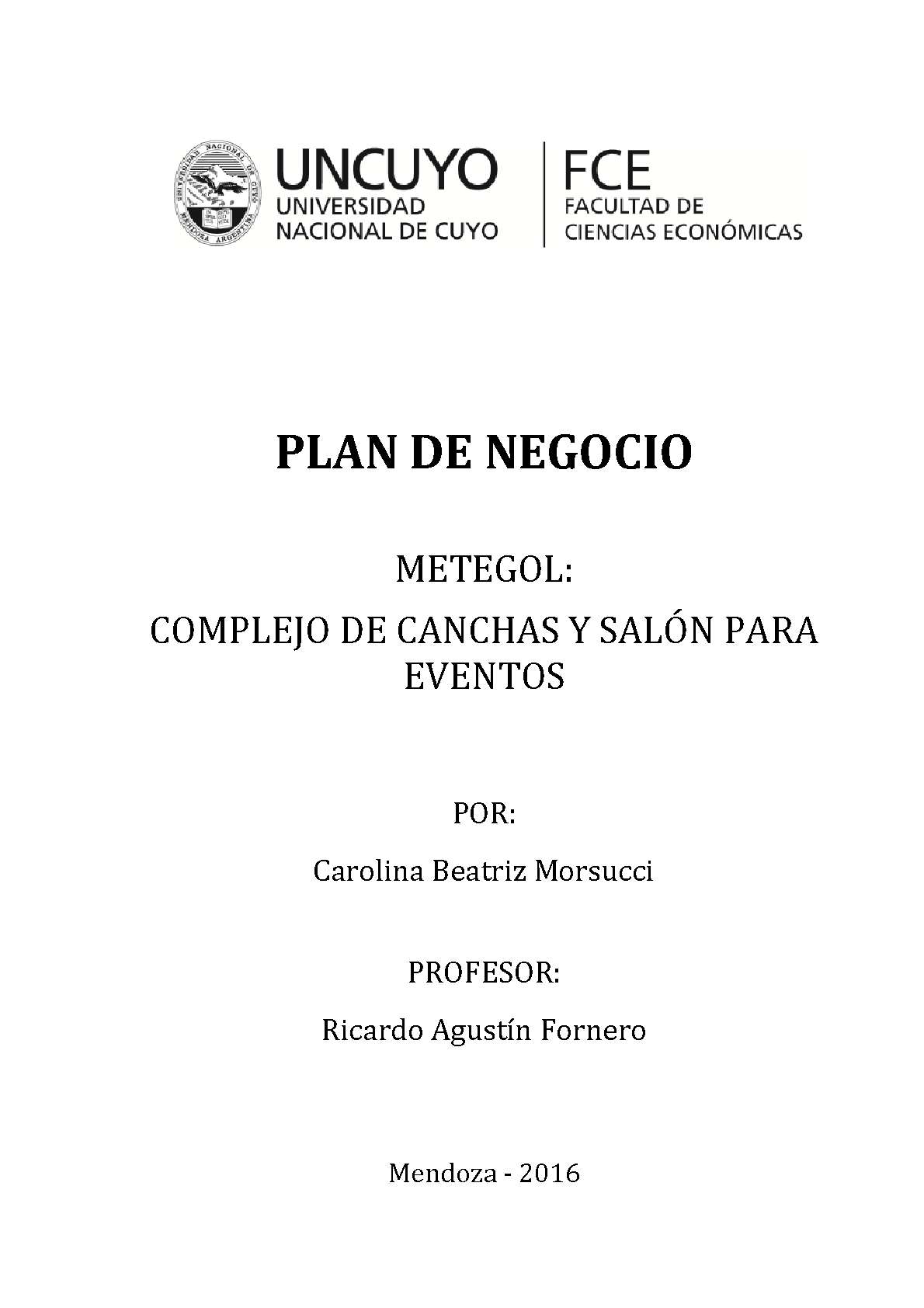 Elaboración de un plan de negocios para la conocer la viabilidad del mismo. Dicho negocio consta en la construcción de un complejo de canchas de fútbol y un salón para eventos. Se analizan diversos factores que influyen en el desarrollo de todo negocio.