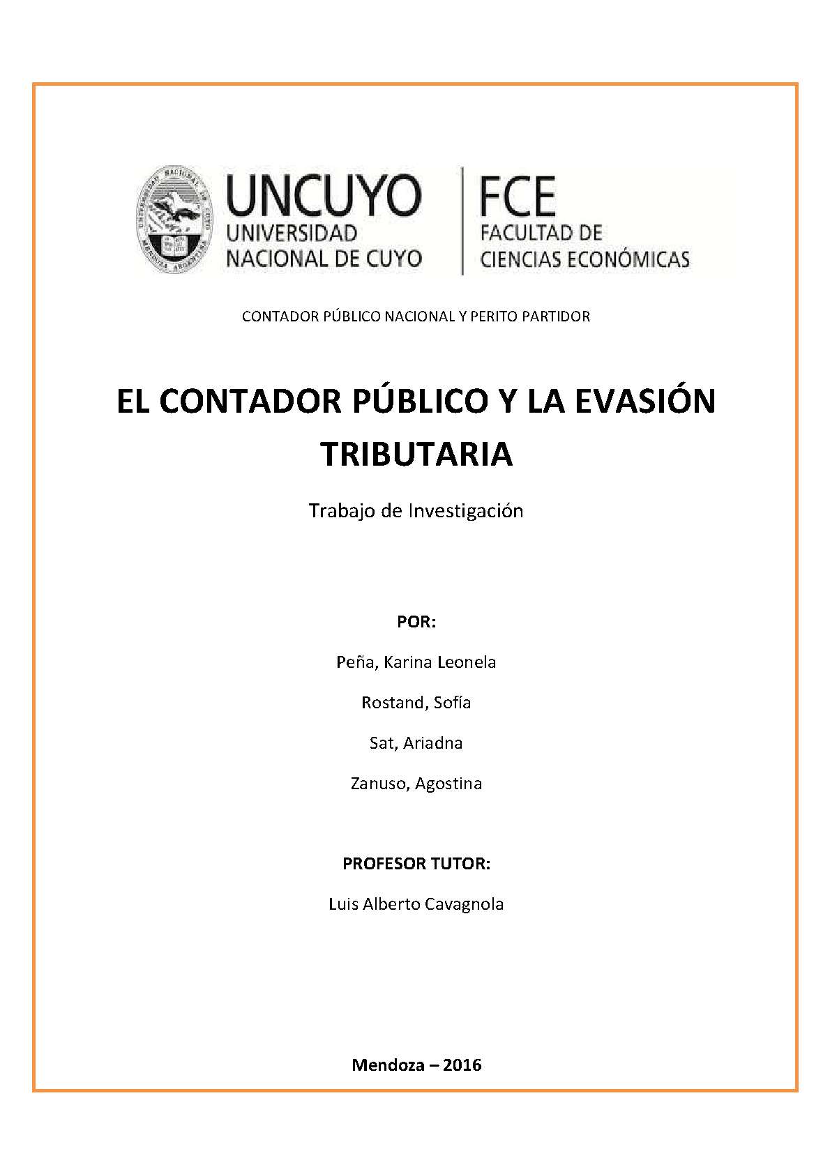 Peña, Karina Leonela; Rostand, Sofía; Sat, Ariadna; Zanuso, Agostina. (2016). El contador público y la evasión tributaria : (Trabajo final de grado). Mendoza, Universidad Nacional de Cuyo. Facultad de Ciencias Económicas.