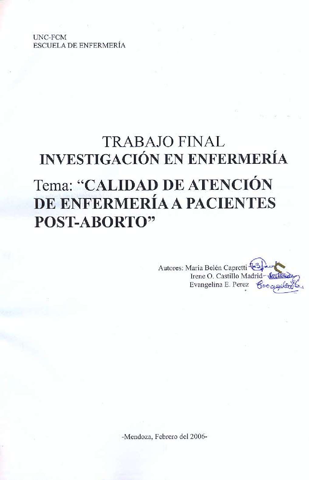 El presente trabajo de investigación fue realizado en el sector de maternidad del Hospital Luis Lagomaggiore de la Ciudad de Mendoza, Argentina, en el año 2005. Su objetivo principal fue el de establecer las características predominantes de la atención de enfermería en las pacientes que habían padecido un aborto, las necesidades de contención de las misma, para luego mejorar la atención que se les brinda. La enfermera es una de las personas más cercana, ya que está con la paciente de manera permanente, por lo tanto debe acompañarla, comprenderla y contenerla; poniendo de manifiesto su parte humana y brindándole una atención integral, afectuosa y completa.