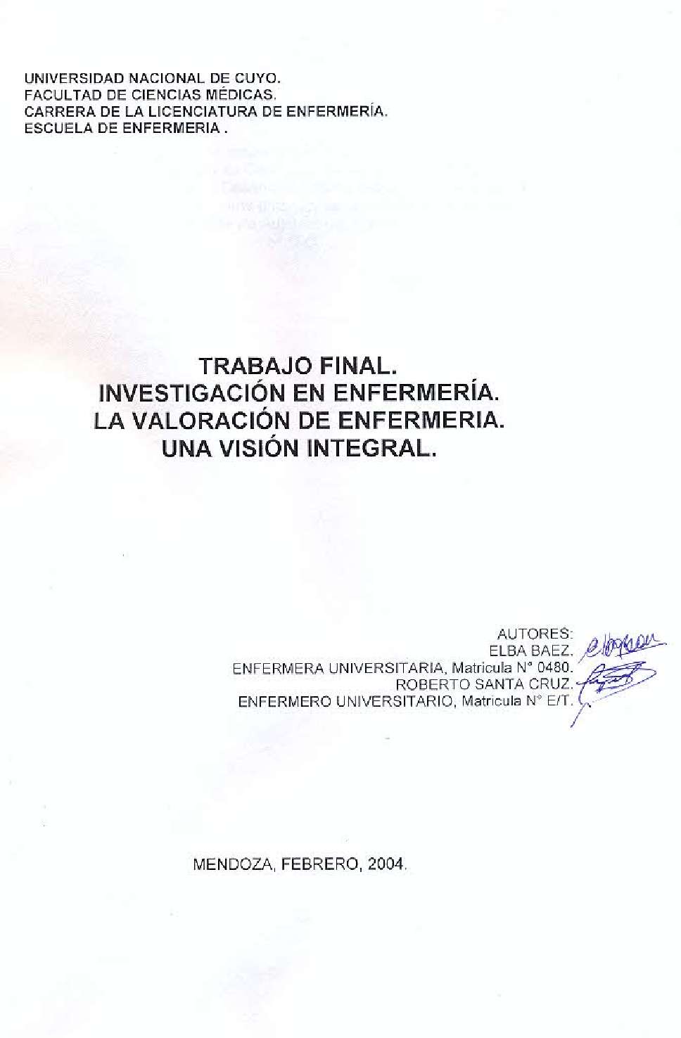 Baez, Elba; Santa Cruz, Roberto. (2004). La valoración de enfermería: una visión integral (Tesina de grado). Mendoza, Universidad Nacional de Cuyo. Facultad de Ciencias Médicas. Escuela de Enfermería..