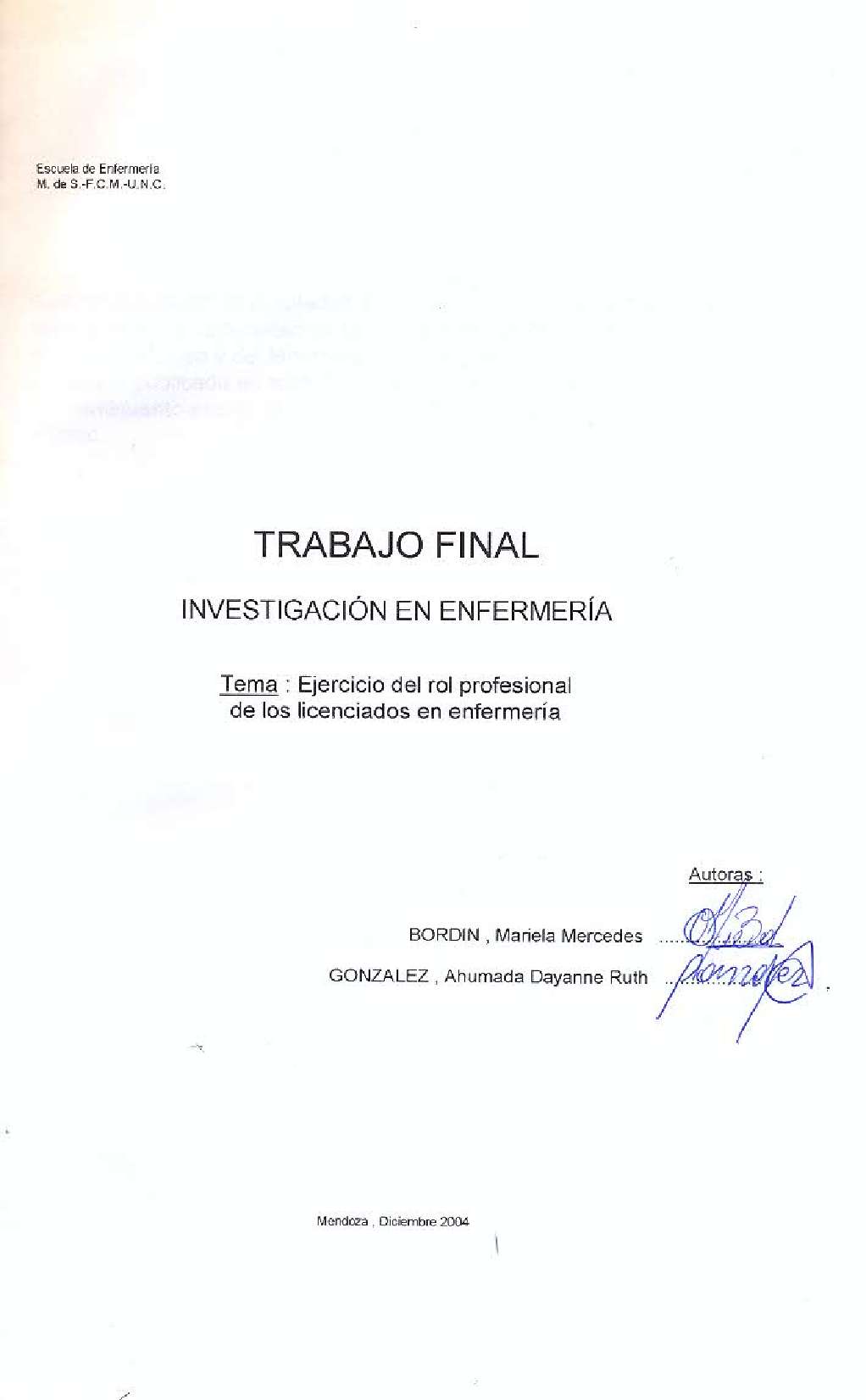 Bordín, Mariela Mercedes; Gonzalez Ahuamada, Dayana Ruth . (2004). Ejercicio del rol profesional de los licenciados en enfermería: (Tesina de grado). Mendoza, Universidad Nacional de Cuyo. Facultad de Ciencias Médicas. Escuela de Enfermería..