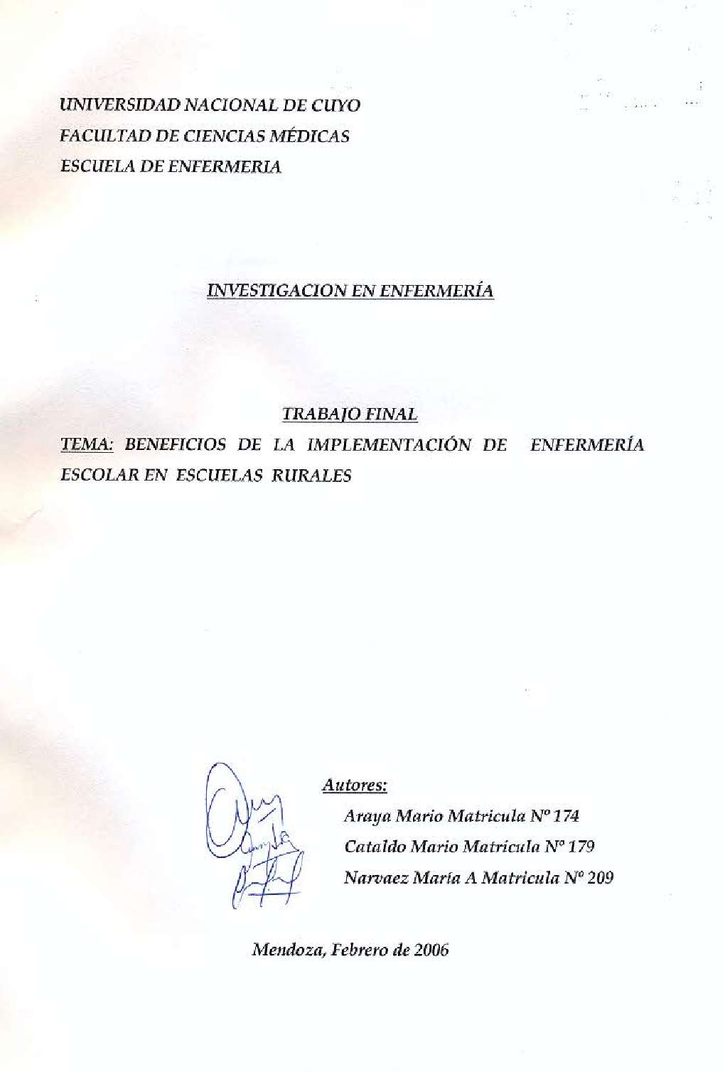 Araya, Mario; Cataldo, Mario; Narvaez, María A.. (2006). Beneficios de la implementación de enfermería escolar en escuelas rurales: (Tesina de grado). Mendoza, Universidad Nacional de Cuyo. Facultad de Ciencias Médicas. Escuela de Enfermería..