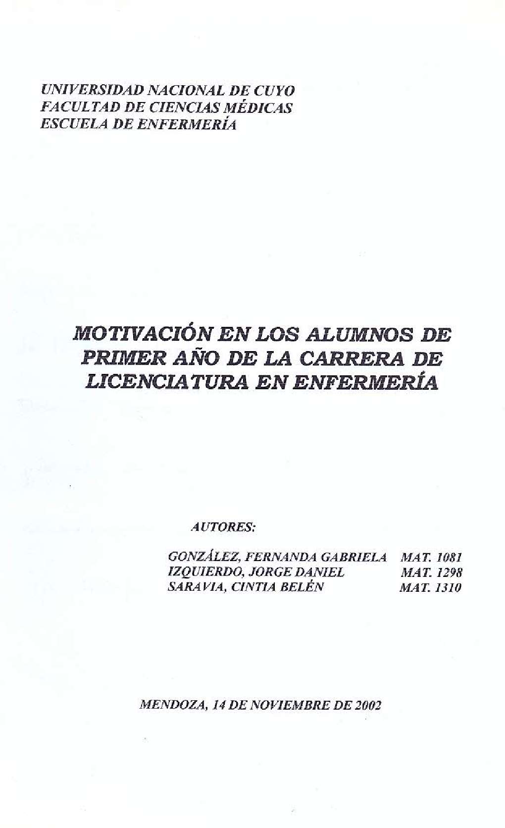 El presente trabajo tiene como propósito establecer cuáles son los factores que influyen sobre la motivación en la carrera de Licenciatura en enfermería para continuar con sus estudios, durante el mes de octubre de 2002. De una población de 45 alumnos ingresantes a primer año solo 36 de ellos brindaron información para realizar esta investigación, y el resto (9) habían desertado o estaban ausentes. Este estudio es de carácter cuantitativo, retrospectivo, transversal y descriptivo. Algunas de las variables evaluadas fueron: elección de la carrera, personas que lo motivaron a estudiar, exigencia del cursado entre otras. Para recolectar datos se realizó una encuesta a cada alumno.