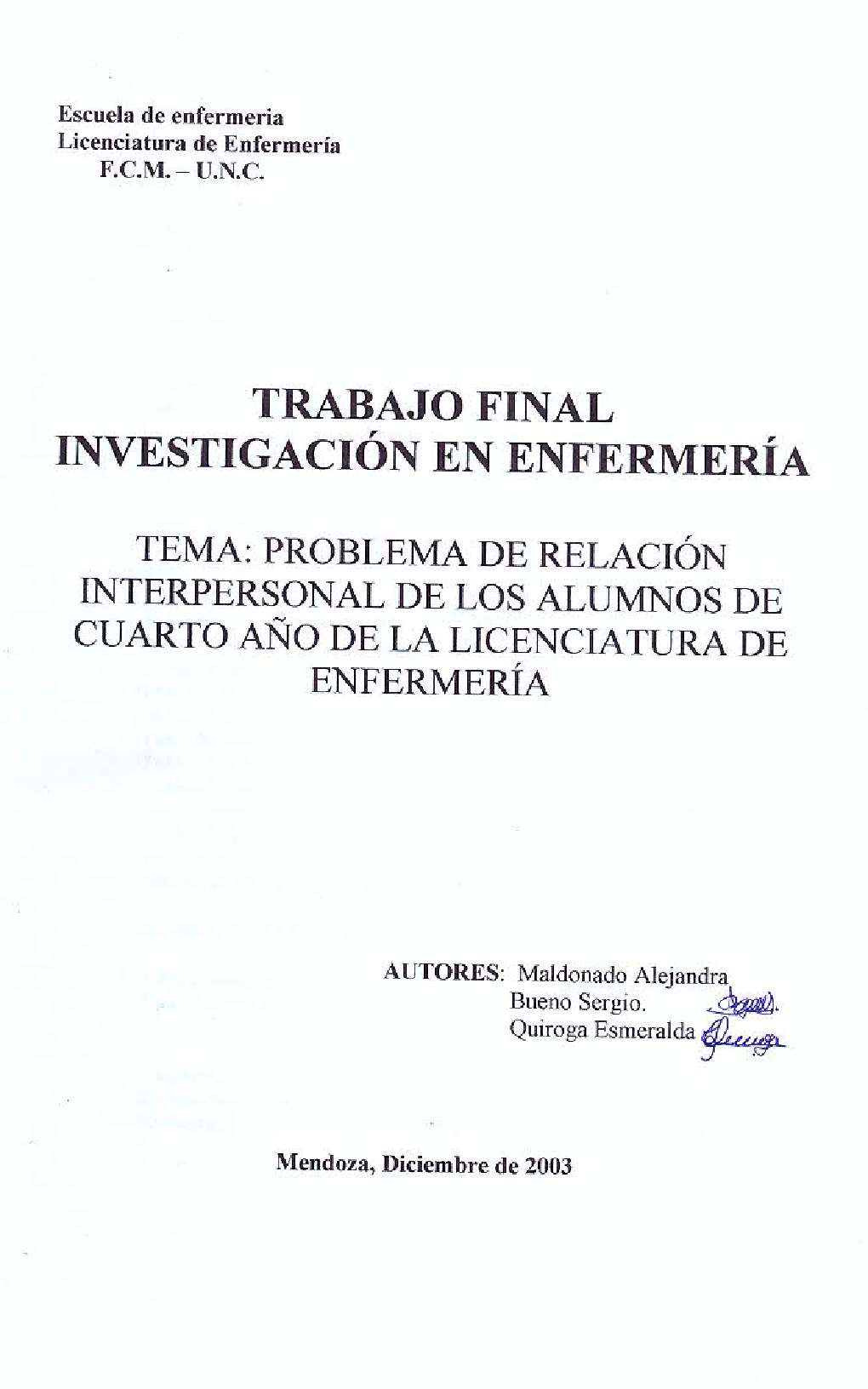 Maldonado, Alejandra; Bueno, Sergio; Quiroga, Esmeralda. (2003). Problema de relación interpersonal de los alumnos de cuarto año de la Licenciatura de Enfermería: (Tesina de grado). Mendoza, Universidad Nacional de Cuyo. Facultad de Ciencias Médicas. Escuela de Enfermería..