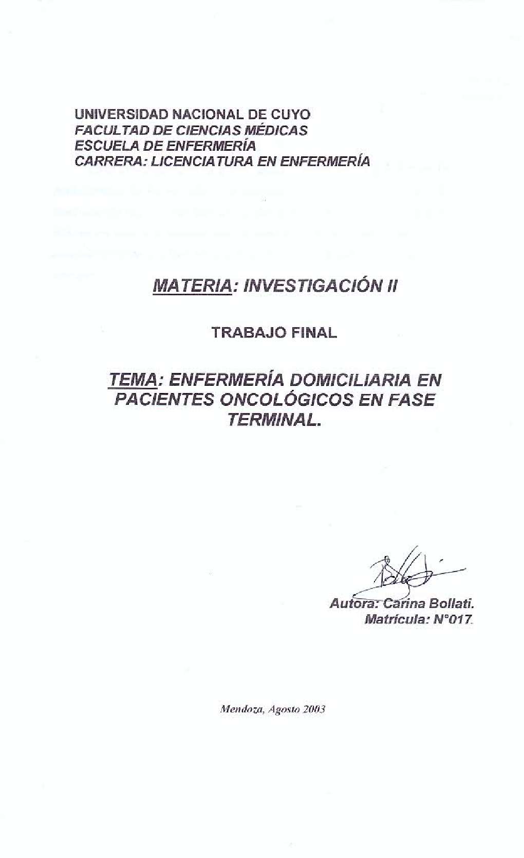 Bollati, Carina. (2003). Enfermería domiciliaria en pacientes oncológicos en fase terminal: (Tesina de grado). Mendoza, Universidad Nacional de Cuyo. Facultad de Ciencias Médicas. Escuela de Enfermería..