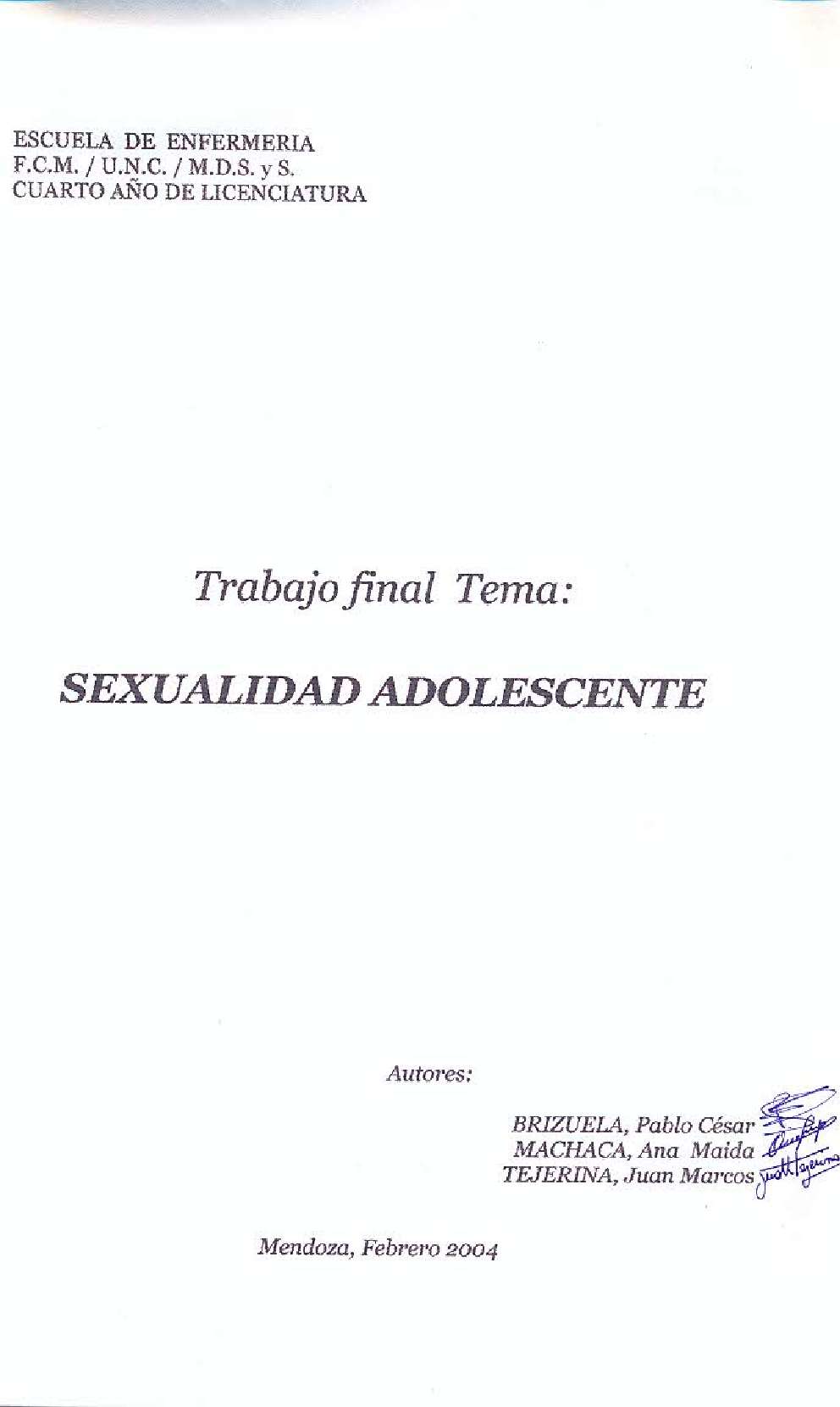 Brizuela, Pablo César; Machaca, Ana Maida; Tejerina, Juan Marcos. (2004). Sexualidad adolescente: (Tesina de grado). Mendoza, Universidad Nacional de Cuyo. Facultad de Ciencias Médicas. Escuela de Enfermería..