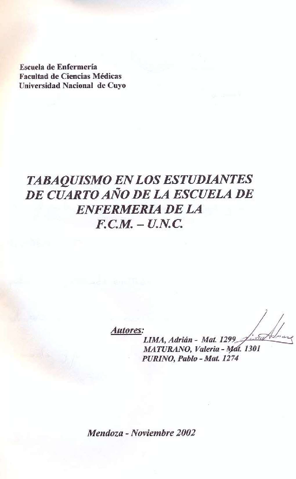 Lima, Adrián; Maturano, Valeria; Purino, Pablo. (2002). Tabaquismo en los estudiantes de cuarto año de la Escuela de Enfermería de la F.C.M-U.N.C: (Tesina de grado). Mendoza, Universidad Nacional de Cuyo. Facultad de Ciencias Médicas. Escuela de Enfermería..