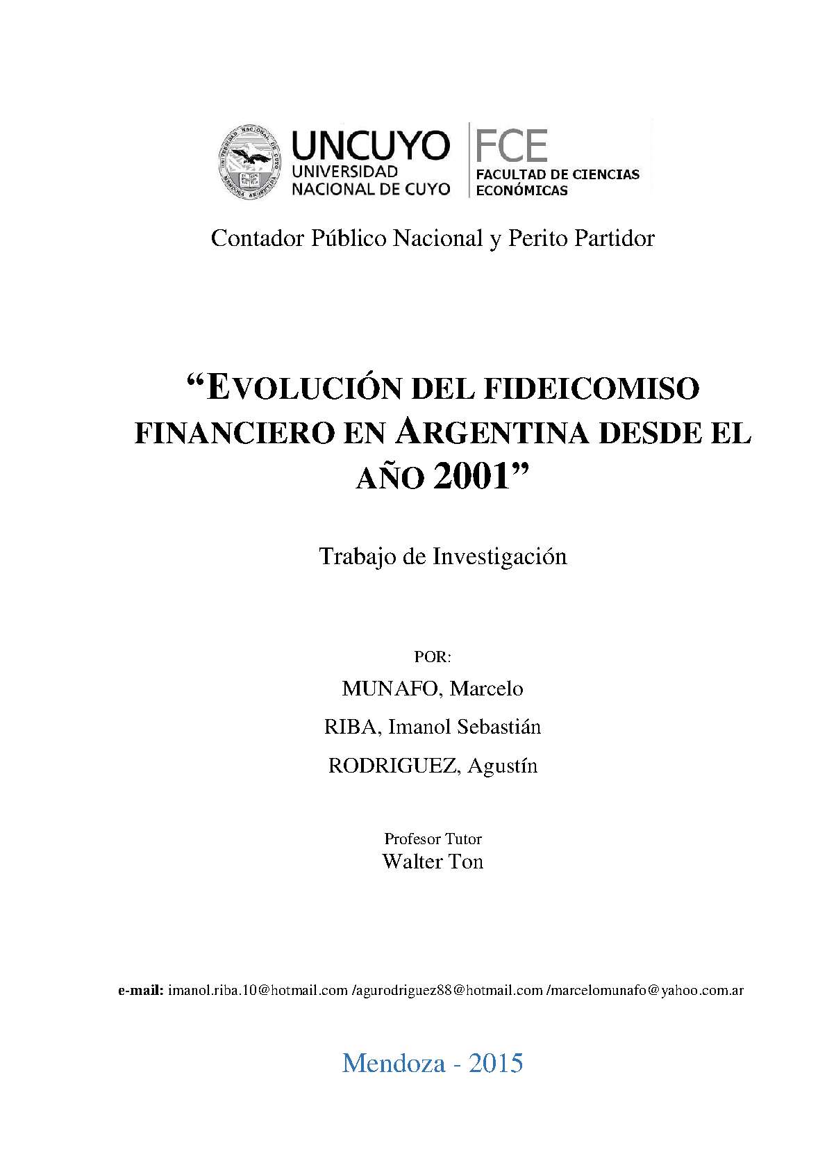 Munafo, Marcelo; Riba, Imanol Sebastián; Rodriguez, Agustín. (2015). Evolución del fideicomiso financiero en argentina desde el año 2001 : (Trabajo final de grado). Mendoza, Universidad Nacional de Cuyo. Facultad de Ciencias Económicas.