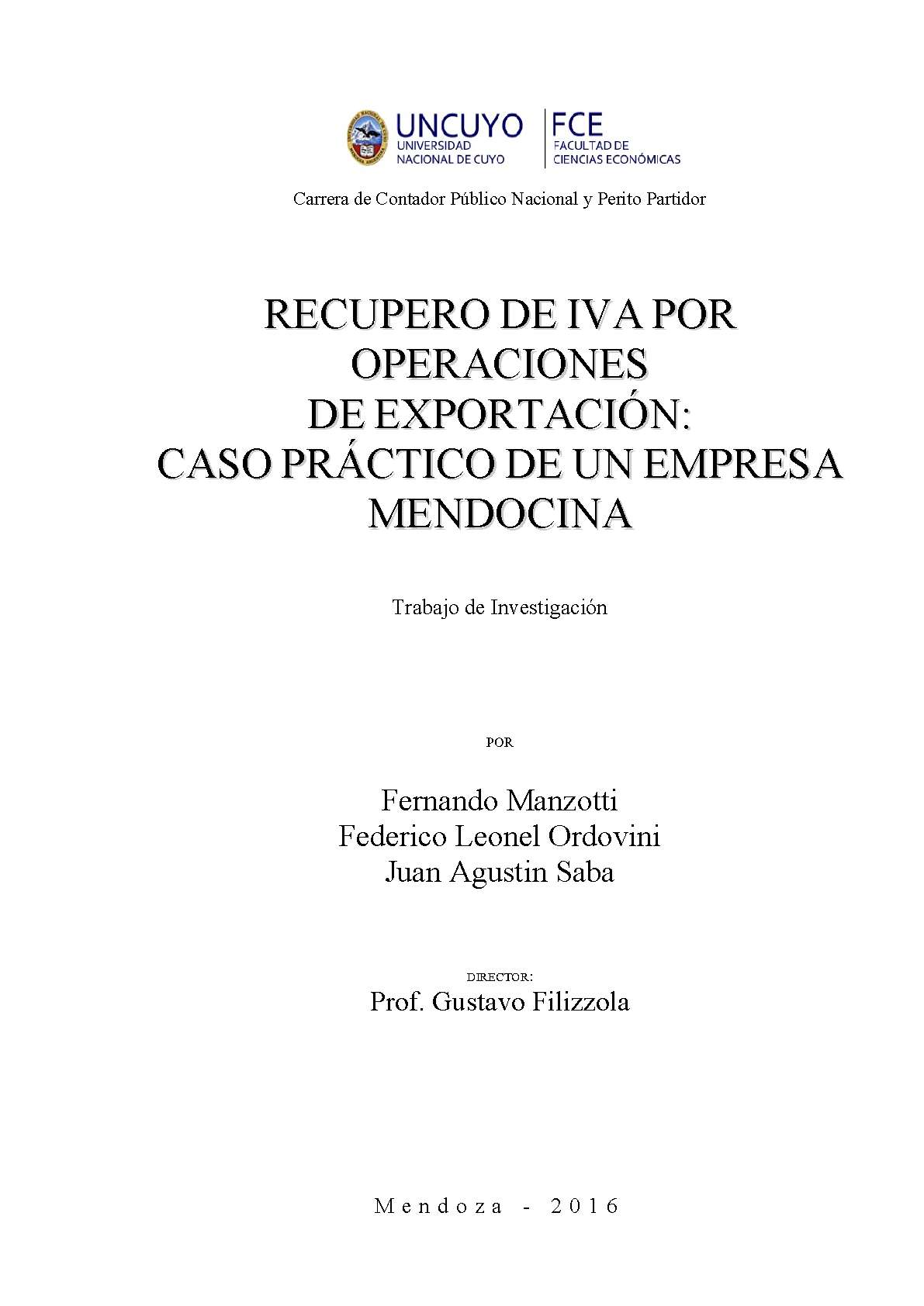 En el presente trabajo se explica el procedimiento práctico seguido por los exportadores de bienes y servicios para determinar el Crédito Fiscal a recuperar que obtienen como consecuencia de compras de insumos y productos necesarios para perfeccionar sus ventas al exterior a sujetos que revisten la calidad de Responsables Inscriptos en el IVA, por lo que en un primer lugar se profundiza sobre conceptos básicos detallados en el Código Aduanero y en el art. 43 de la ley de impuesto al valor agregado, N° 23.349/86 y sus modificaciones, como así también se le da énfasis a la Resolución General 2.000/06 de la Administración Federal de Ingresos Públicos (AFIP) y a su modificatoria n° 3.397/2012.