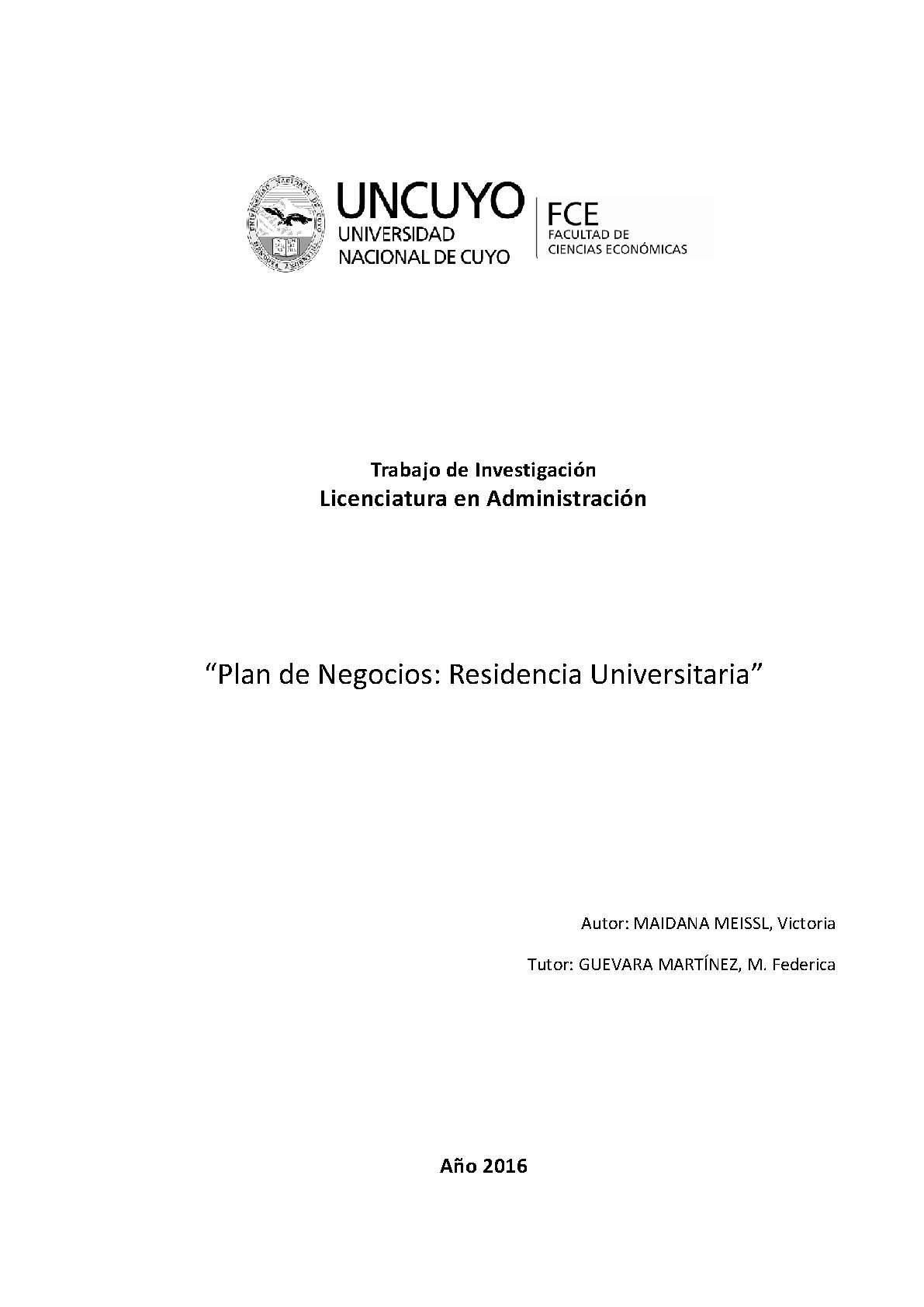 El objetivo principal de este trabajo es analizar si es viable o no la apertura de una residencia universitaria en la ciudad de Mendoza. Para ello se desarrolla un plan de negocios que contiene todos los aspectos necesarios para poder describir la idea, el servicio, analizar el micro y macro entorno, como así también un análisis FODA. Se realiza un plan financiero, operativo, administrativo, de recursos humanos etc. Se pretende analizar una forma de alojamiento que dé respuesta a los cambios en el contexto como al habitante estudiantil, es decir, cómo el contexto responde a las necesidades de este nuevo estudiante, y como este último puede potenciar su entorno por medio de la satisfacción de sus necesidades.
