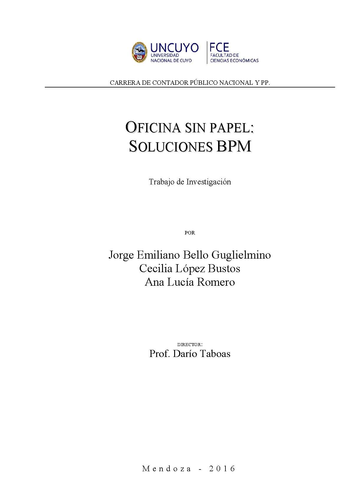 Bello Guglielmino, Jorge Emiliano; López Bustos, Cecilia; Romero, Ana Lucía. (2016). Oficina sin papel: soluciones BPM (Trabajo final de grado). Mendoza, Universidad Nacional de Cuyo. Facultad de Ciencias Económicas.