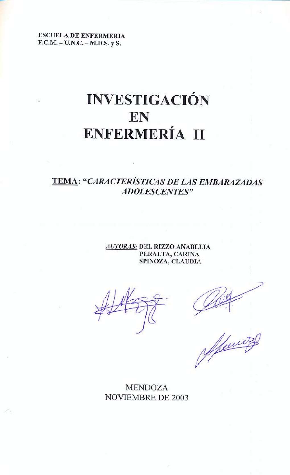 El objetivo principal de este estudio es determinar cuáles son las características prevalentes de la población femenina de las alumnas de la Escuela de Enfermería, Facultad de Ciencias Médicas, Universidad Nacional de Cuyo, que cursaron o cursan un embarazo adolescente no planificado entre los años 2000 y 2003. Es un estudio de tipo cuantitativo. Se trabajó con una muestra de 27 alumnas, a las que se les realizó una encuesta. Se evaluaron factores personales, educacionales, familiares, económicos y controles de embarazo, entre otros aspectos.