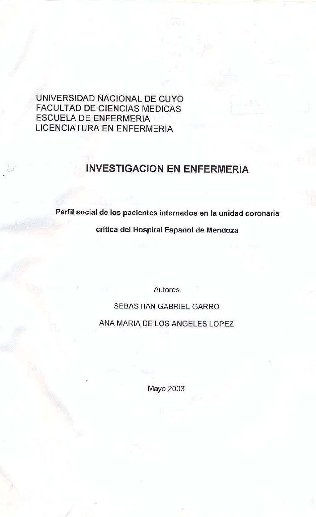 El objetivo principal de este estudio es describir y comparar las realidades del perfil social de los pacientes internados en Unidad Coronaria del Hospital Español, Mendoza y un estudio desarrollado por un grupo multidisciplinario de la Fundación René Favaloro (1998-1999). Se realizó durante el periodo entre enero de 1999 y enero de 2000. Es un estudio de tipo descriptivo, transversal y retrospectivo. Como método de recolección de datos se recurrió a la observación de historias clínicas con datos como son hipertensión arterial, antecedentes familiares y patológicos, infarto agudo de miocardio, controles, ocupación laboral, actividad física, cobertura social, entre otros. De un total de 300 historias clínicas de pacientes internados es este servicio durante 1999 y 2000 se trabajó con una muestra de 60 de ellas.