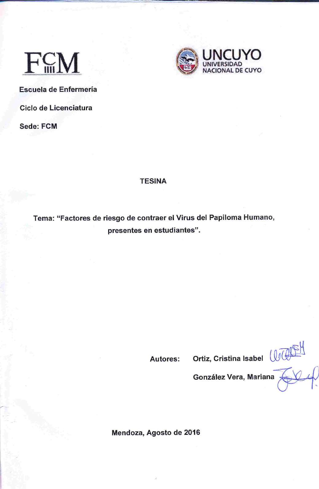 FACTORES DE RIESGO - ESTUDIANTES UNIVERSITARIOS - UNIVERSIDAD NACIONAL DE CUYO. DIRECCIÓN DE SALUD ESTUDIANTIL - SERVICIOS DE SALUD PARA LOS ESTUDIANTES - INFECCIONES POR PAPILLOMAVIRUS/PREVENCIÓN Y CONTROL - PAPILLOMAVIRIDAE - NEOPLASIAS DEL CUELLO UTERINO - CONDUCTA SEXUAL