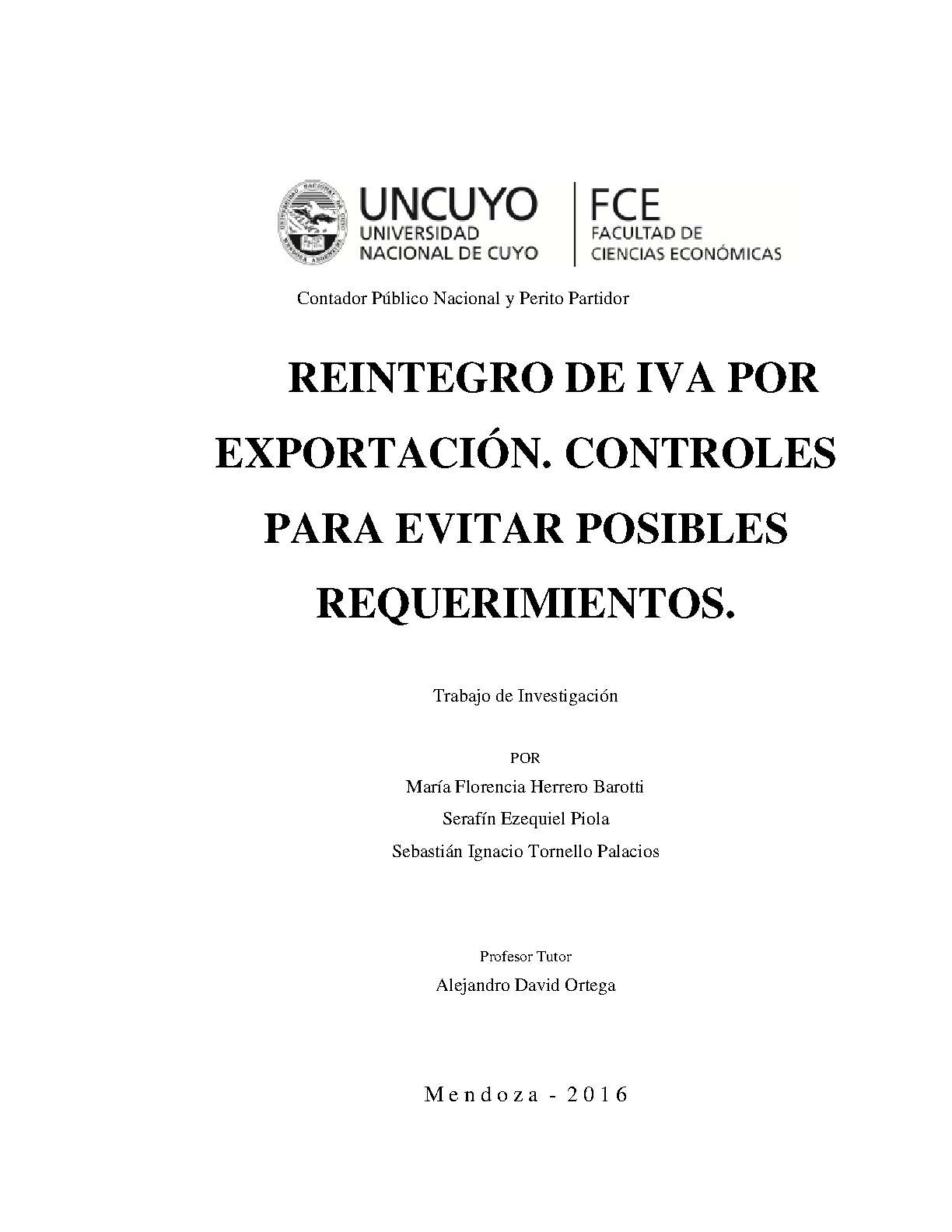 Herrero Barotti, María Florencia; Tornello Palacios, Sebastián Ignacio; Piola, Serafín Ezequiel. (2016). Reintegro de IVA por exportación: controles para evitar posibles requerimientos (Trabajo final de grado). Mendoza, Universidad Nacional de Cuyo. Facultad de Ciencias Económicas.