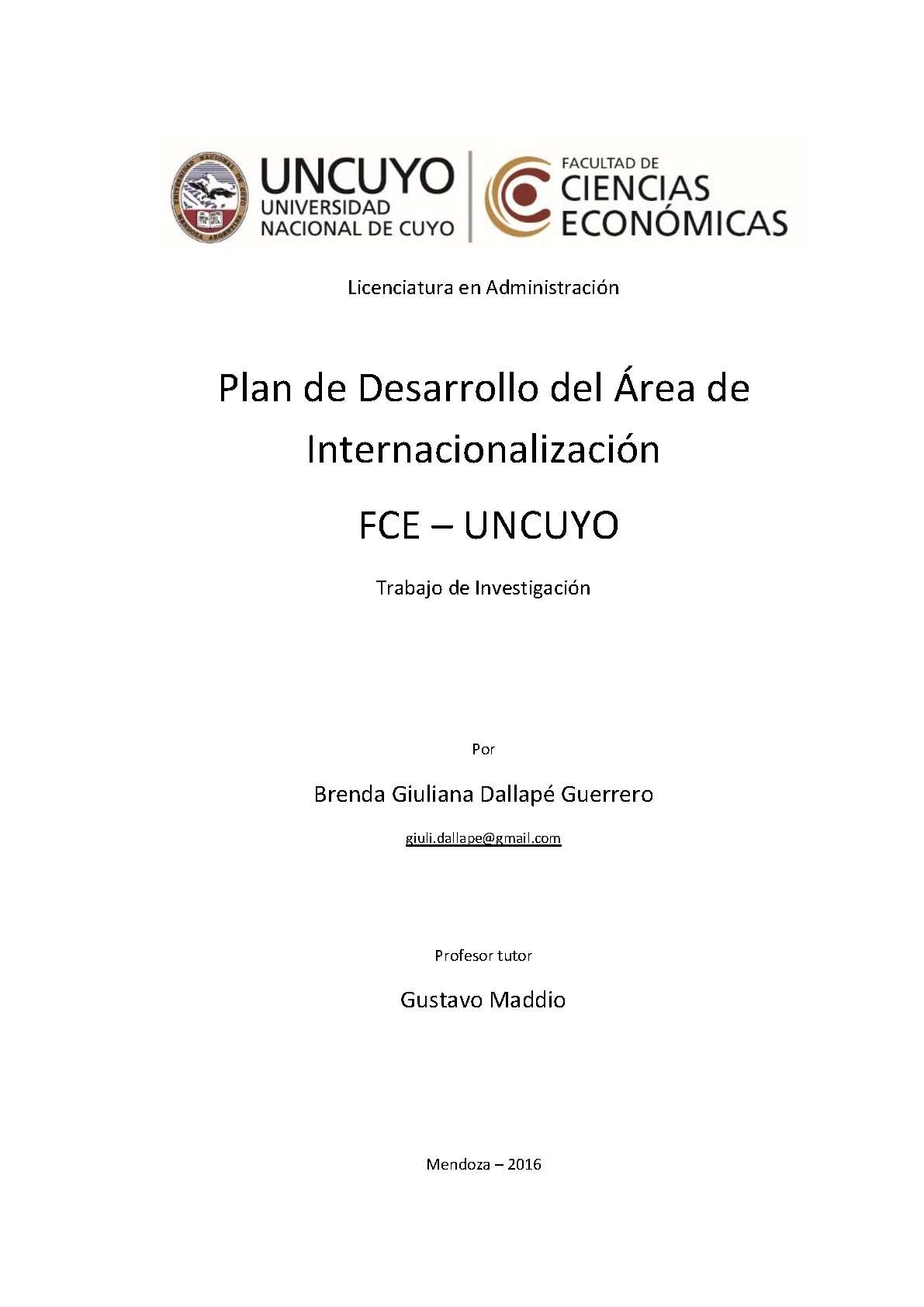Dallapé Guerrero, Brenda Giuliana. (2016). Plan de desarrollo del Área de Internacionalización FCE – UNCUYO: (Trabajo final de grado). Mendoza, Universidad Nacional de Cuyo. Facultad de Ciencias Económicas.
