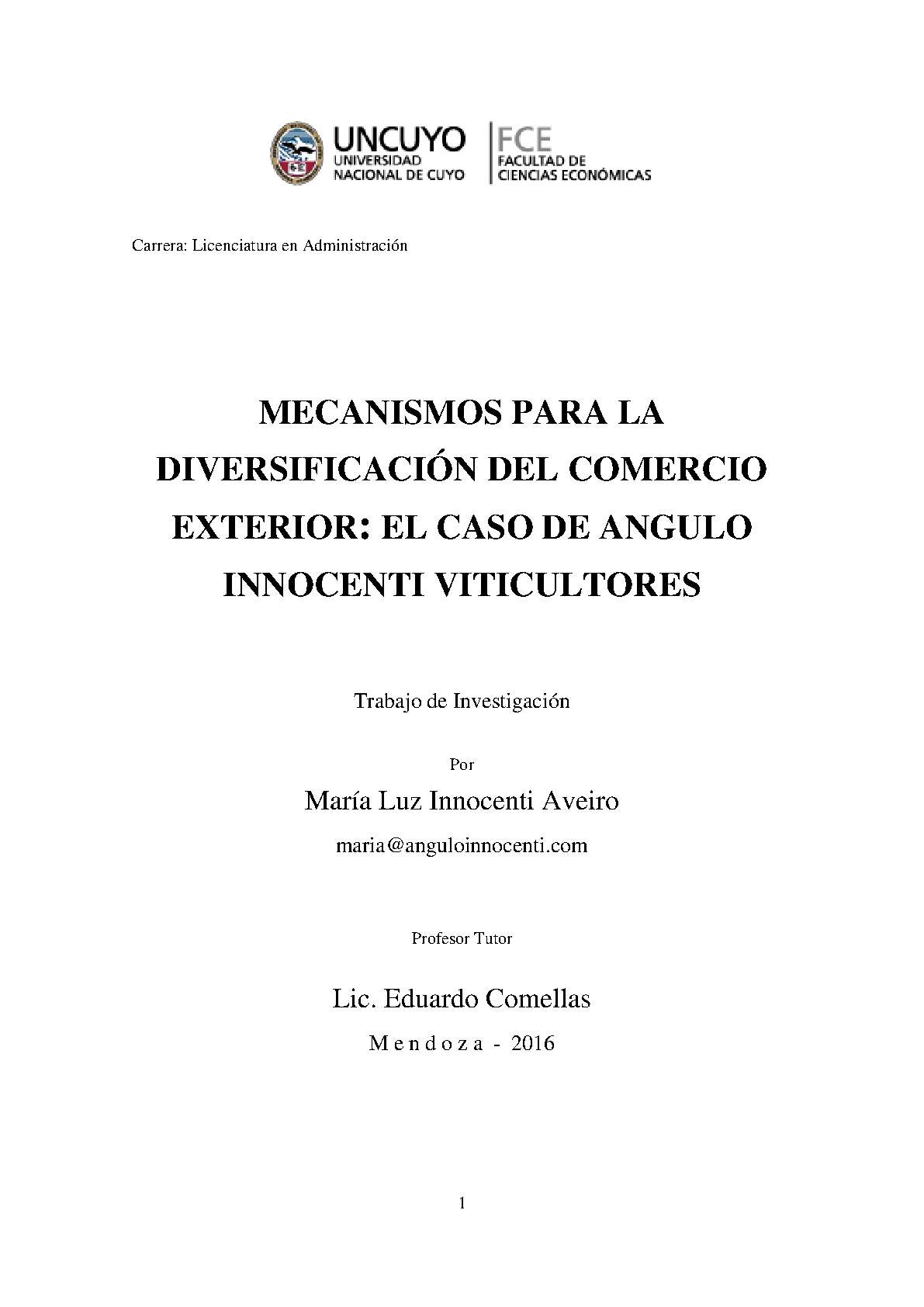 Innocenti Aveiro, María Luz. (2016). Mecanismos para la diversificación del comercio exterior: el caso de Angulo Innocenti Viticultores (Trabajo final de grado). Mendoza, Universidad Nacional de Cuyo. Facultad de Ciencias Económicas.