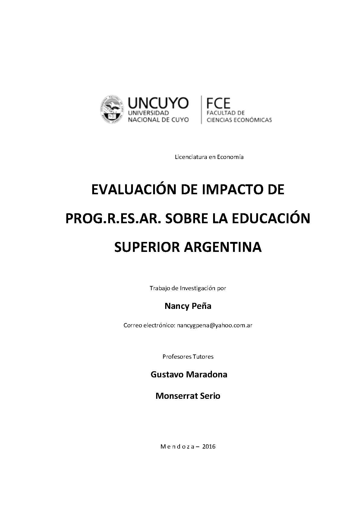 Peña, Nancy Gimena. (2016). Evaluación de impacto de PROG.R.ES.AR: sobre la educación superior argentina (Trabajo final de grado). Mendoza, Universidad Nacional de Cuyo. Facultad de Ciencias Económicas.