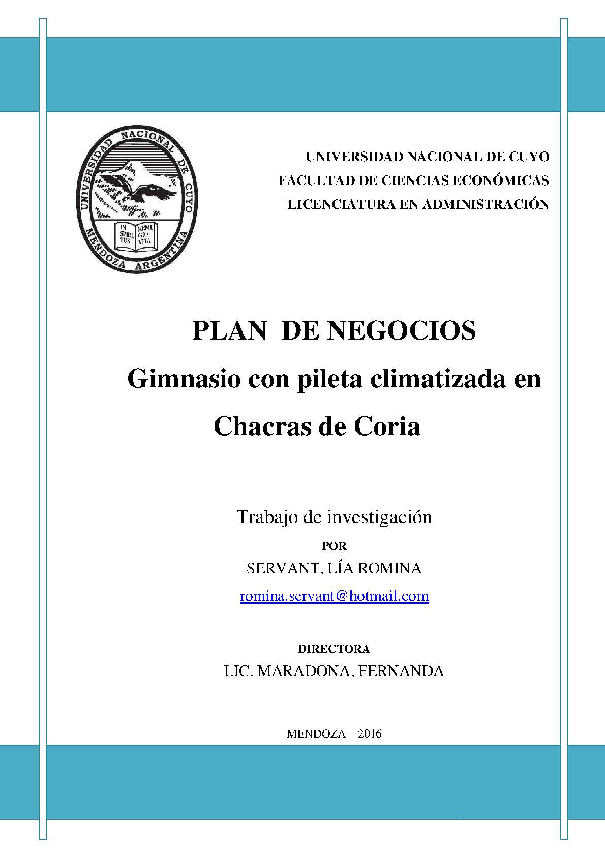 En el presente trabajo se desarrolla un plan de negocios que describe la implementación en la zona de Chacras de Coria, del Departamento de Luján de Cuyo, Mendoza, de un gimnasio con pileta climatizada. Éste prestará un servicio integral que abarca la enseñanza de diferentes actividades deportivas, teniendo como principal objetivo el bienestar del cliente.