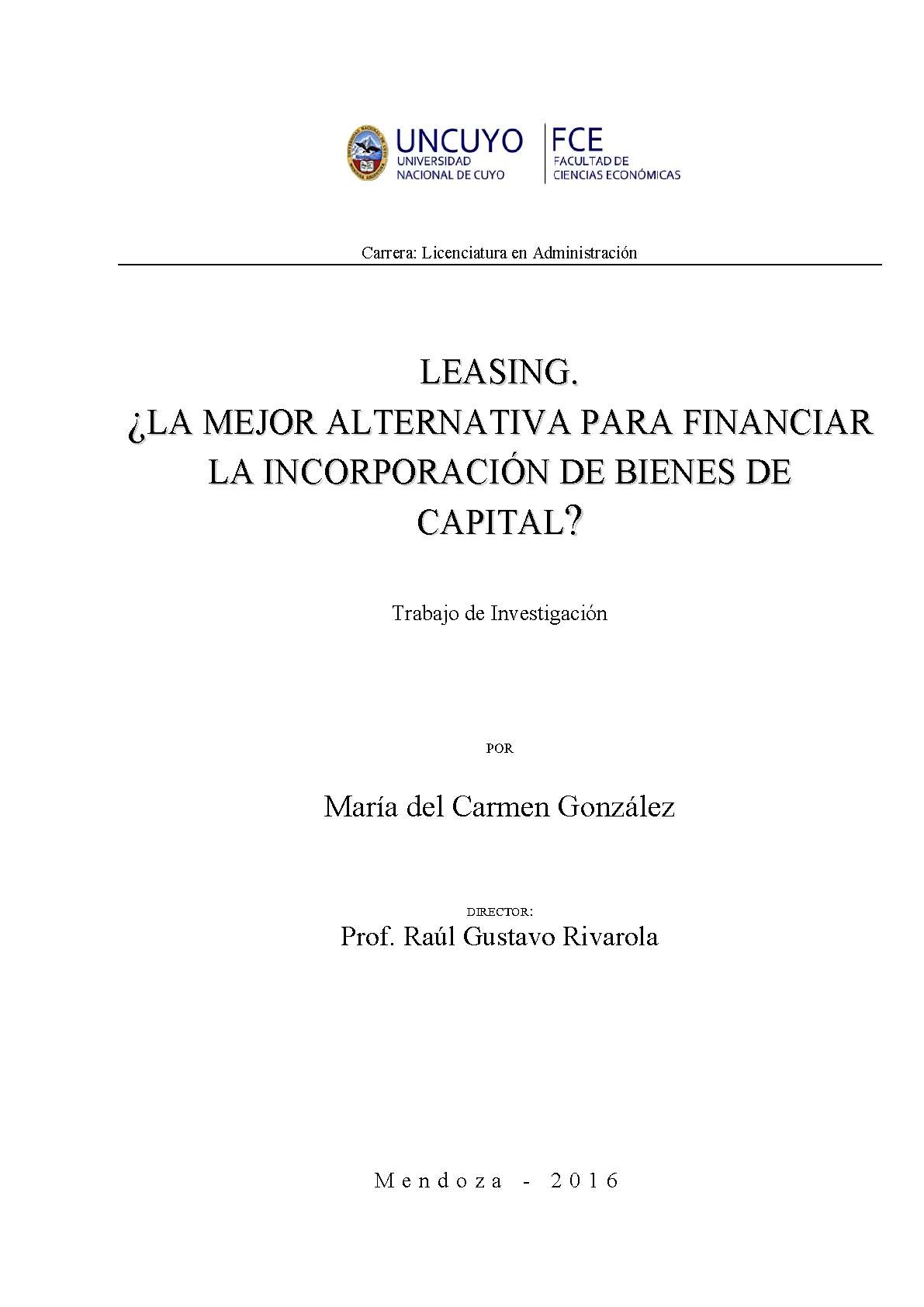 González, María del Carmen. (2016). Leasing: ¿la mejor alternativa para financiar la incorporación de bienes de capital? (Trabajo final de grado). Mendoza, Universidad Nacional de Cuyo. Facultad de Ciencias Económicas.