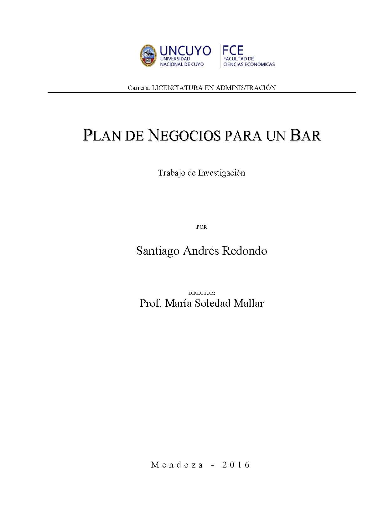 Redondo,Santiago Andrés. (2016). Plan de negocios para un bar : (Trabajo final de grado). Mendoza, Universidad Nacional de Cuyo. Facultad de Ciencias Económicas.