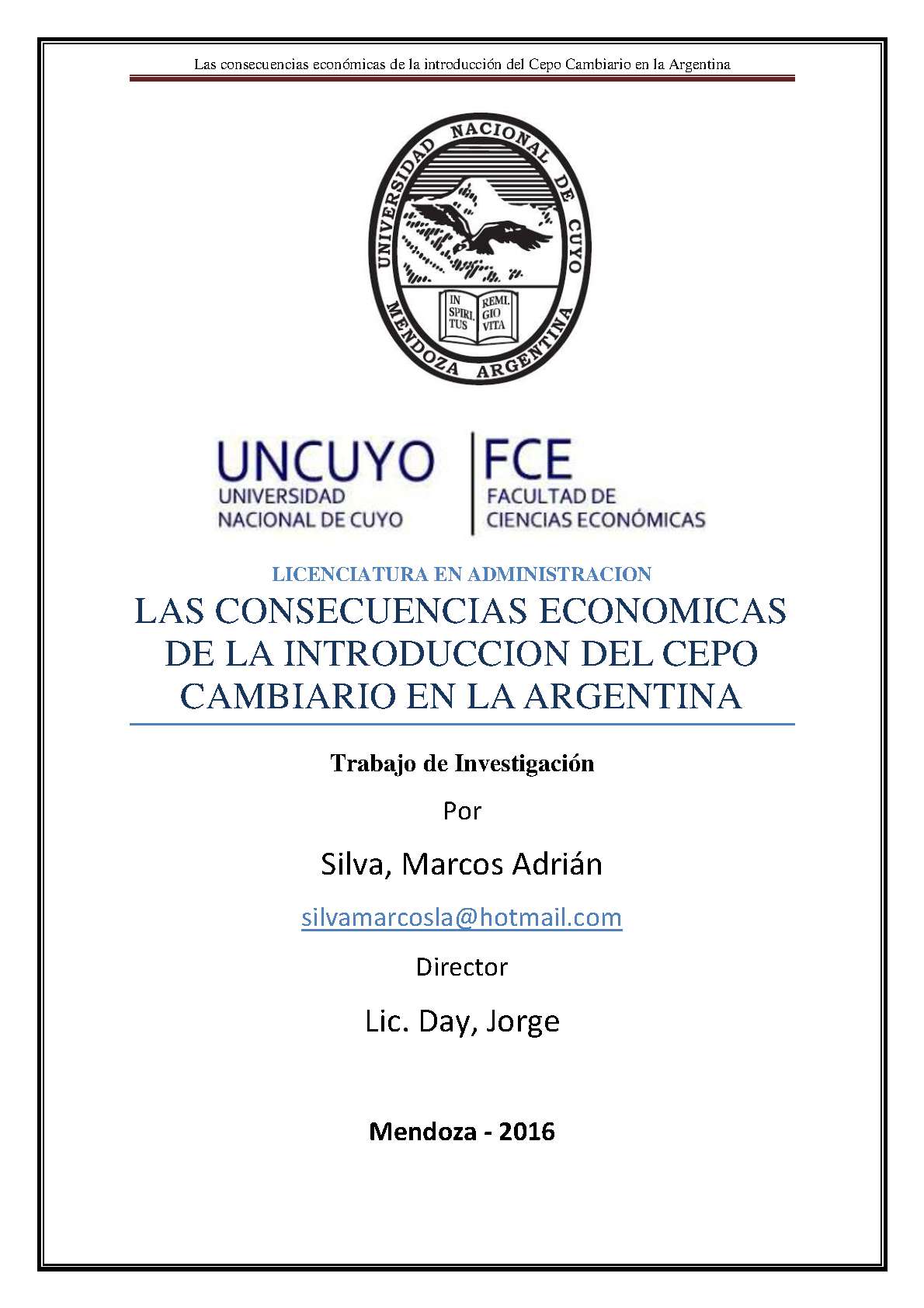 Silva, Marcos Adrián. (2016). Las consecuencias económicas de la introducción del cepo cambiario en la Argentina : (Trabajo final de grado). Mendoza, Universidad Nacional de Cuyo. Facultad de Ciencias Económicas.