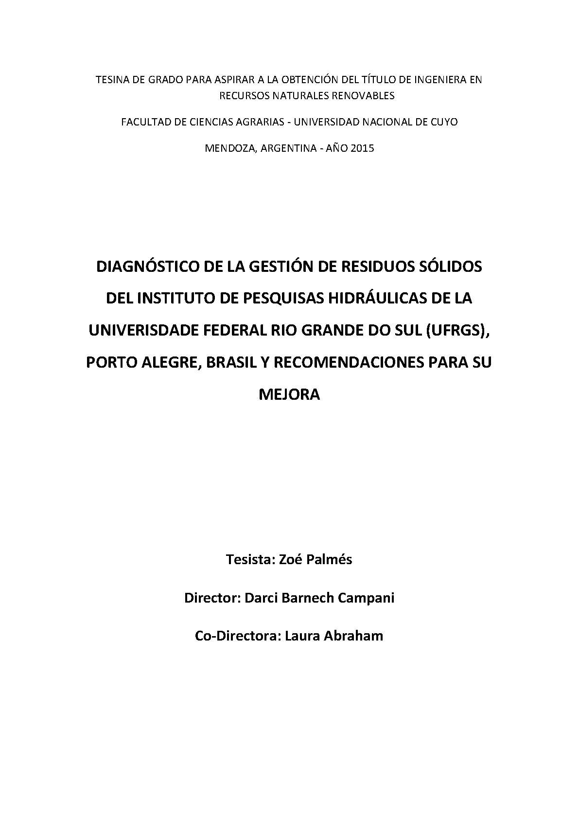 Diagnóstico de la gestión de residuos sólidos del Instituto de Pesquisas Hidráulicas de la Universidade Federal Río Grande do Sul (UFRGS), Porto Alegre, Brasil y recomendaciones para su mejora