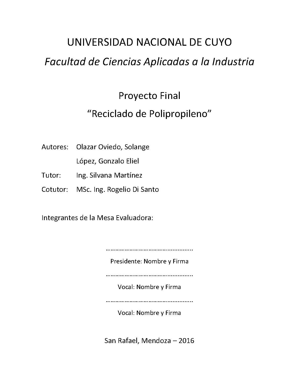 Olazar Oviedo, Solange; Lopez, Gonzalo Eliel. (2016). Reciclado de polipropileno: (Trabajo final de grado). Mendoza, Universidad Nacional de Cuyo. Facultad de Ciencias Aplicadas a la Industria .