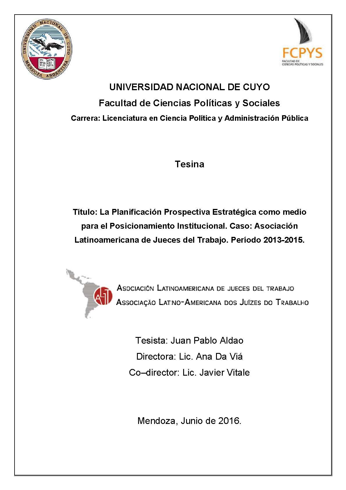 Aldao, Juan Pablo. (2016). La planificación prospectiva estratégica como medio para el posicionamiento institucional: caso: Asociación Latinoamericana de Jueces del Trabajo : período 2013-2015 (Trabajo final de grado). Mendoza, Universidad Nacional de Cuyo. Facultad de Ciencias Políticas y Sociales .