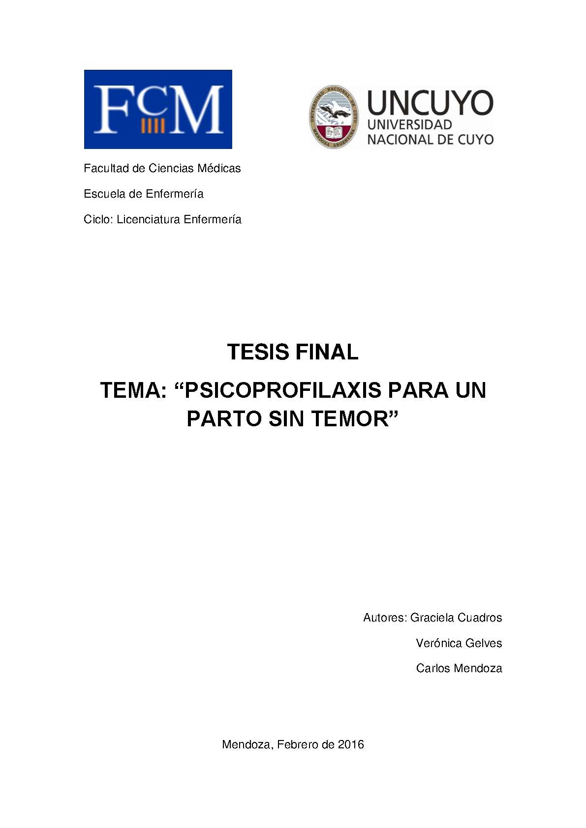 Cuadros, Graciela; Gelvez, Verónica; Mendoza, Carlos. (2016). Psicoprofilaxis para un parto sin temor: (Tesina de grado). Mendoza, Universidad Nacional de Cuyo. Facultad de Ciencias Médicas. Escuela de Enfermería..