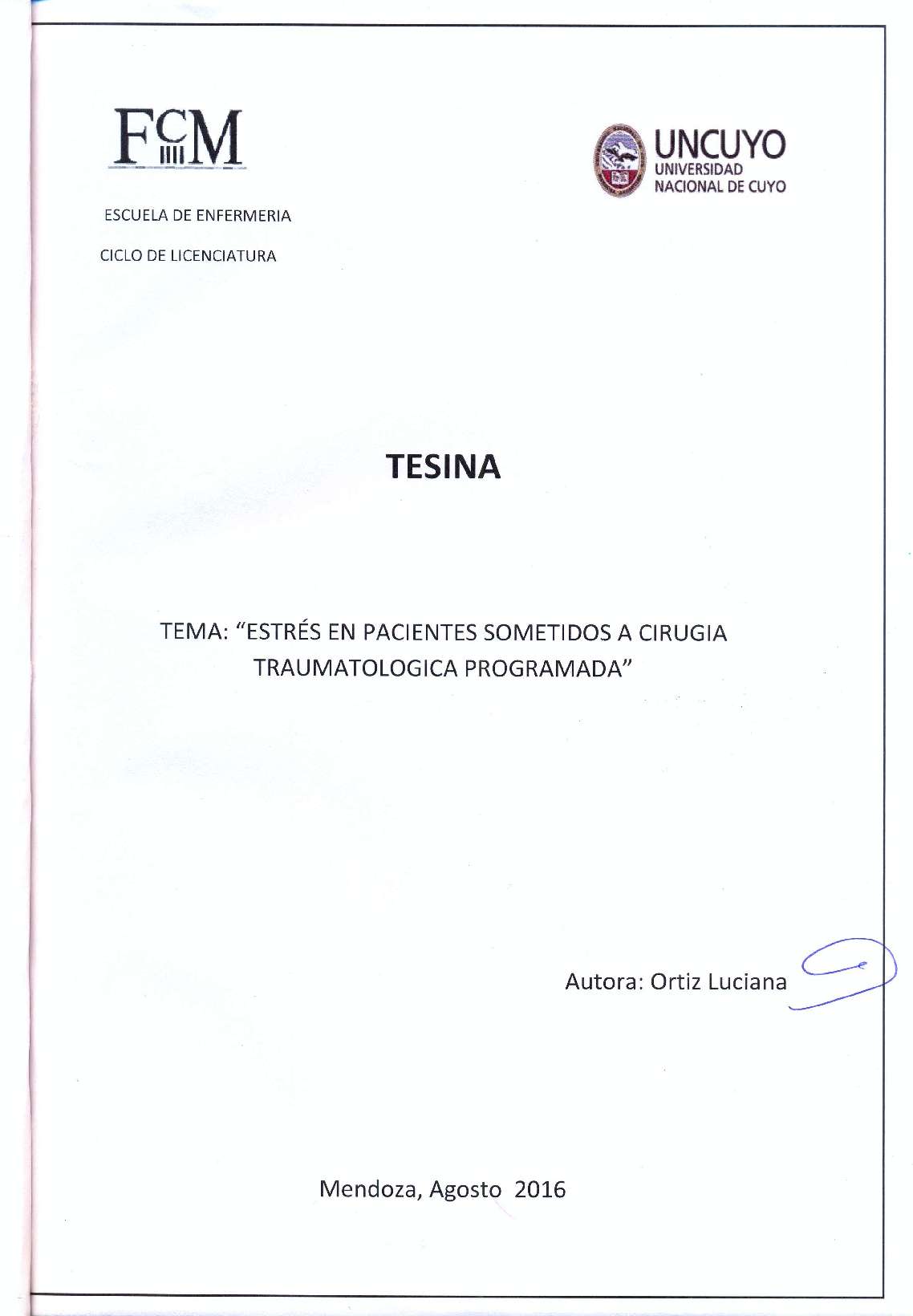 Ortiz, Luciana. (2016). Estrés en pacientes sometidos a cirugía traumatológica programada: (Tesina de grado). Mendoza, Universidad Nacional de Cuyo. Facultad de Ciencias Médicas. Escuela de Enfermería..
