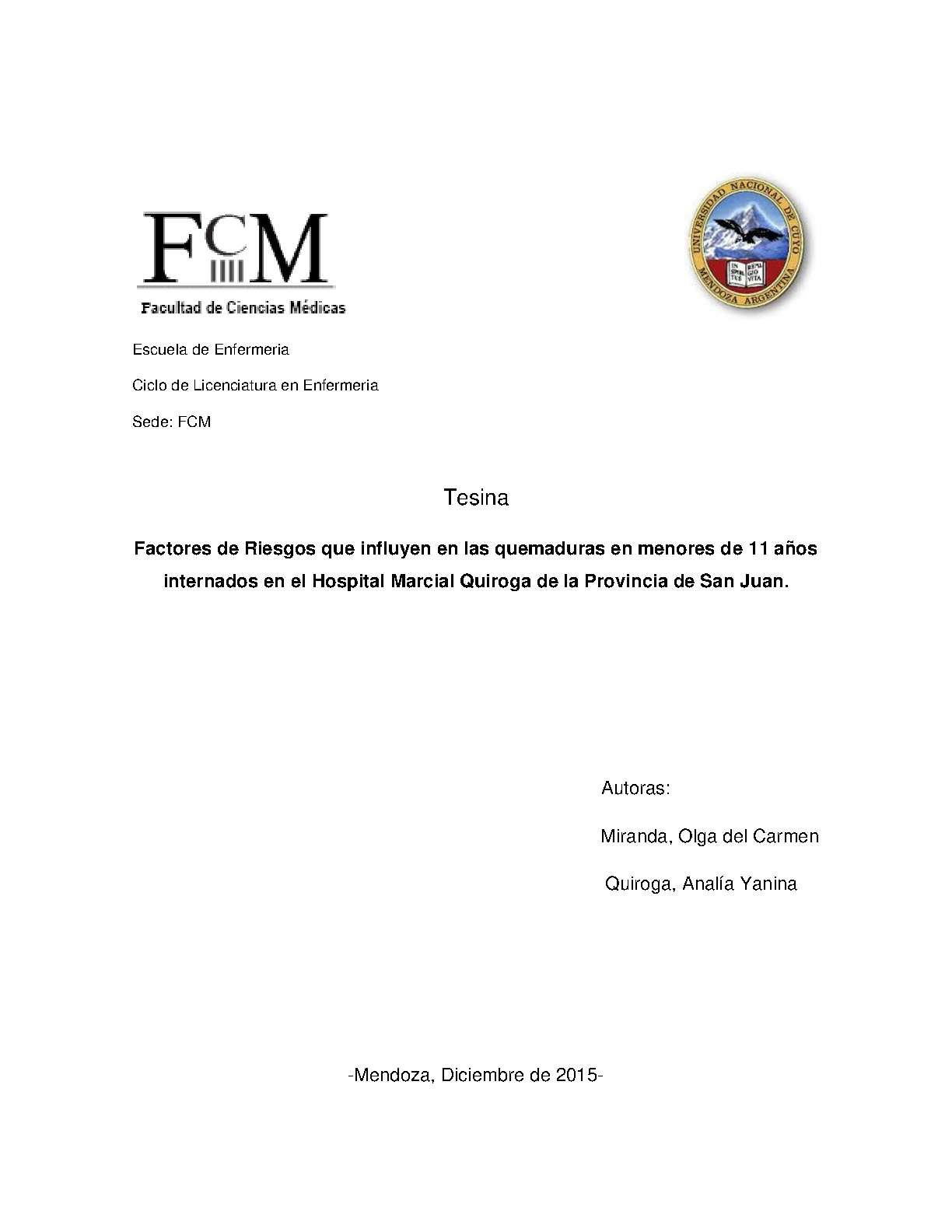 A nivel mundial las quemaduras en la infancia son una causa importante de morbilidad y mortalidad, representan la segunda causa de muerte, después de los accidentes de tráfico. El propósito de este trabajo es determinar e identificar cuáles son los factores de riesgos más frecuentes que ocasionan quemaduras en menores de 11 años que ingresaron al Servicio General de Quemados del Hospital Marcial Quiroga de la Provincia de San Juan, en durante los años 2013-2015. En esta investigación también se habla de cómo desde el punto de vista la enfermería contribuirá a educar a las personas, para aumentar la toma de conciencia de las misma y puedan evitar este tipo de accidentes. Es un estudio de tipo cuantitativo, descriptivo, de corte transversal exploratorio. Se tomó como muestra a todos los menores de 11 años ingresados al Servicio de Quemado de dicho hospital en los años 2013 al 2015 (143 en total). Los datos fueron obtenidos por medio de reportes de internados y altas hospitalarias proporcionadas por el personal administrativo del nosocomio.