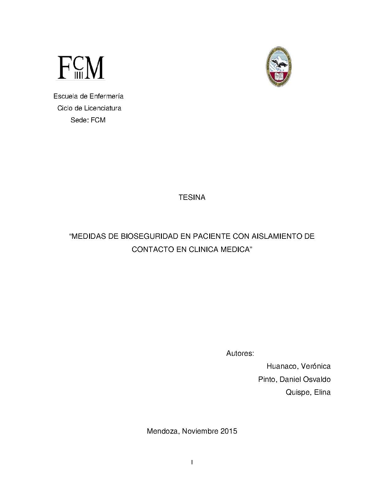 A pesar de los avances en salud, la forma más efectiva de detener la diseminación de una infección de paciente a paciente, y de paciente al personal de salud o viceversa es mediante la buena práctica de las medidas de bioseguridad en pacientes con aislamiento de contacto. Por lo tanto, la participación por parte del personal de enfermería resulta fundamental a la hora de realizar técnicas y procedimientos necesarios en la atención de estos pacientes. El objetivo de esta investigación es determinar en qué grado se aplican las medidas de bioseguridad por parte del personal de enfermería del Servicio de Clínica Médica del Hospital Central, Mendoza, durante la ejecución de diversos procedimientos al paciente internado con aislamiento de contacto, en el 2015. Es un estudio con diseño de tipo cuantitativo, descriptivo, transversal, explicativo y aplicado al campo de estudio. La población y muestra fueron 36 enfermeros de los servicios de Clínica Médica Este – Oeste, los que respondieron un modelo de encuesta con preguntas cerradas.