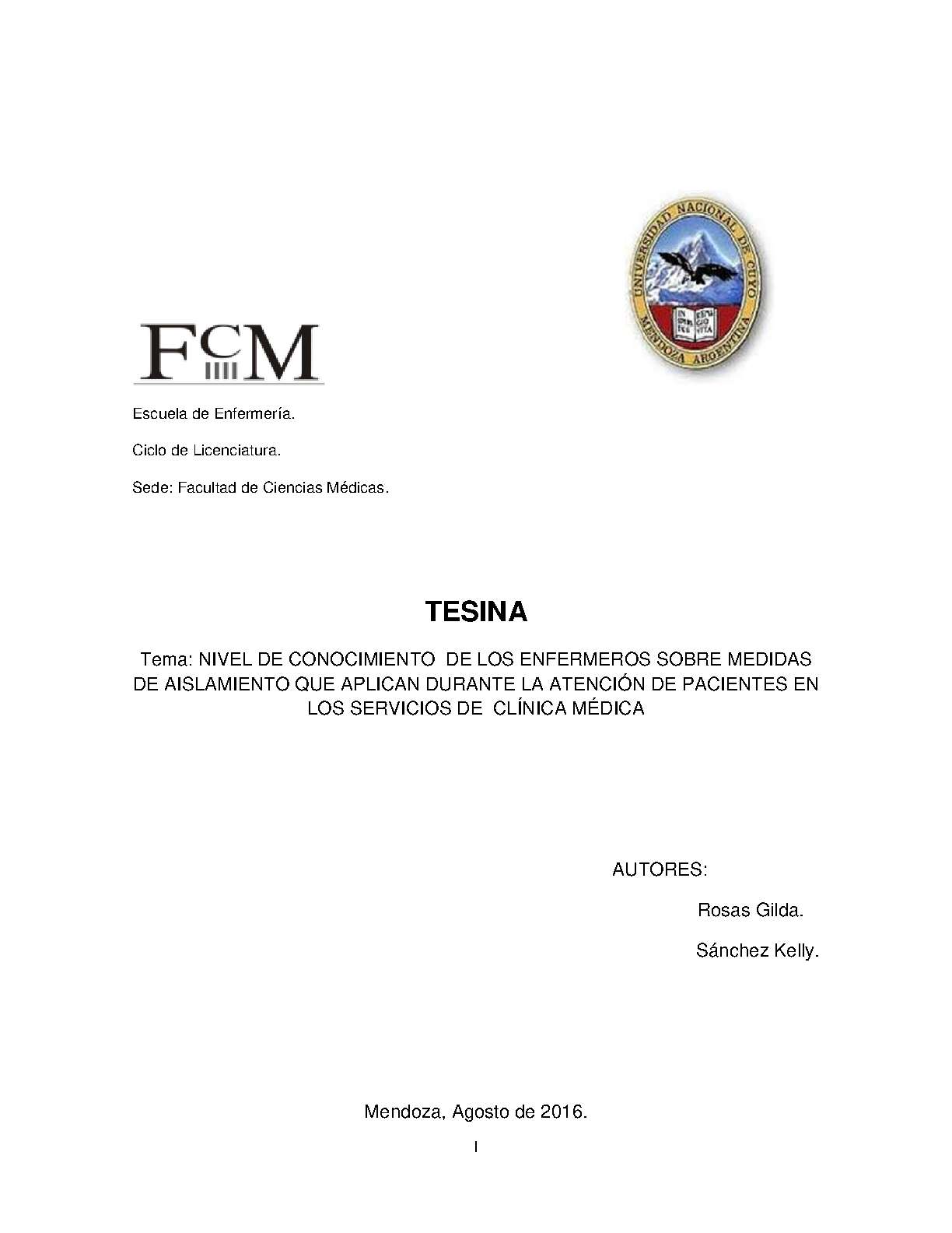 El personal de enfermería cumple un rol muy importante en el control de las infecciones hospitalaria, ya sea a través de la aplicación de las normas de bioseguridad, así como también con el cumplimiento de las medidas de aislamiento, ya que si no las cumple no sólo ellos se encuentran en riesgo sino también ponen en riesgo a los pacientes en general. El objetivo de esta investigación es determinar el nivel de conocimiento de los enfermeros sobre medidas de aislamiento que aplican durante la atención de pacientes en los servicios de Clínica Médica “A" y “B" del Hospital El Carmen, Godoy Cruz, Mendoza durante el segundo semestre de 2015. Es un estudio de naturaleza descriptiva, cuantitativa, de corte transversal, de tipo no experimental. La población en estudio fueron 33 (100%) enfermeros del servicio de Clínica Médica los que respondieron un cuestionario de preguntas cerradas.